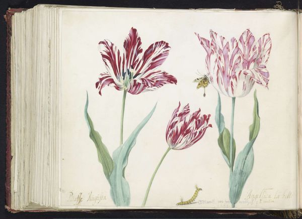 Editor: So, here we have "Two Tulips with Two Flies" made between 1640 and 1645 by Jacob Marrel, a painting in watercolor. It looks very precise and scientific, almost. What stands out to you about this work? Curator: As a materialist, I immediately think of the tulip mania that gripped the Dutch Republic at this time. These aren’t just pretty flowers; they're commodities. These tulips, with their flamed petals, would have been highly prized, reflecting the intense desire and speculation surrounding particular bulbs. What do you make of the flies? Editor: That's a good point about the tulip mania, and it is important to acknowledge the class aspect, as tulip ownership would have been a privilege. As for the flies, are they included as part of the realism or for symbolism, maybe relating to vanity or decay? Curator: Consider the medium itself, watercolor. It’s a delicate, laborious technique perfectly suited to capturing the fragile beauty of these blooms. And think about the social context of botanical illustration – often commissioned by wealthy patrons who were eager to document and possess rare specimens. Do you see any link there? Editor: I see. So, the painting functions as both a scientific record and a symbol of status and wealth. It bridges the gap between art, science, and commerce, and the painstaking technique reflects that value! The flies may signify how fleeting or easily damaged beauty may be. Curator: Exactly! This piece invites us to examine the intersection of artistic skill, natural resources, and the social structures that assign value. It prompts us to consider who has access to beauty and knowledge, and what material conditions make such images possible. Editor: I'll certainly remember the role of materials and social context now, to look at art through a different lens.