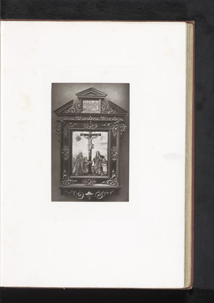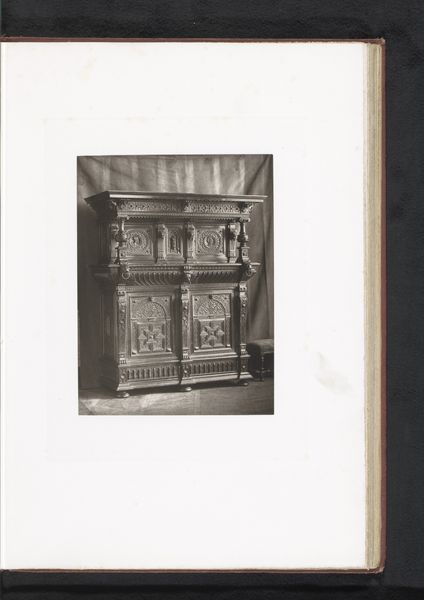 Curator: Well, let's begin by looking at this photograph from 1873. The description identifies it as "Kast in de stijl van Hendrik III van Frankrijk, opgesteld tijdens de Exposition Rétrospective van 1873 in Tours, Frankrijk" a mouthful, but the point is that it's documenting a French chest in the style of Henry III, exhibited that year in Tours. Editor: It’s quite imposing, isn't it? Even in this image, the deep carving creates a powerful, weighty presence. You can feel the craftsmanship. Curator: Absolutely. These revival styles were quite popular at the time, particularly those looking back at earlier periods of perceived national glory. The cabinet references a style from centuries past. The choice to display and document it reflects how societies actively rewrite and re-contextualize history through objects. Editor: What intrigues me most is the inherent performativity of the piece itself and this photograph: the object on display within an exhibition designed to showcase French artisanship and style. This chest isn't just an object, but a statement about cultural legacy and power structures embedded within. The choice of style—evoking a past King, Henry III—also adds layers of complexity, specifically those about idealized masculinity and control. Curator: Right. It raises interesting questions about the accessibility of the original object versus this photograph. Who could have owned a cabinet like that, and who gets to view this version of it in photographic form? Who are these displays aimed toward? It begs the questions: what stories are being prioritized and perpetuated through images like these, and how does that affect who gets to imagine themselves within it? Editor: It feels very much about reclaiming an aesthetic—asserting a certain identity—and of course the power and exclusivity that always accompanies that sort of statement. You can almost read the chest as a representation of the social hierarchies of its time. Curator: Precisely. Even now, encountering a photographic depiction rather than the original adds another remove—layering accessibility with distance, really revealing how we construct historical narratives through visual cues and institutional framing. I am really glad we took a close look at that one today. Editor: Me too. A valuable reminder that material objects can be read in conversation with broader themes about cultural and gendered expectations.