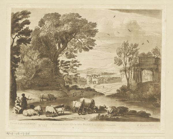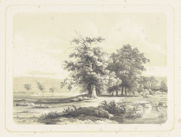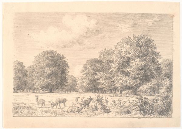 Editor: Okay, so next up we have "The Deer Pond," an etching and engraving by Charles-François Daubigny, likely completed between 1837 and 1878. It's a pretty idyllic landscape, very detailed considering it's essentially a print. What strikes me most is the stillness... What are your initial thoughts? Curator: It's interesting that you picked up on the stillness. Daubigny, though sometimes associated with the Barbizon school, occupies a fascinating place in the history of art. This etching really highlights the shifting role of landscape during the 19th century. We see a departure from purely picturesque or romanticized depictions toward something more…real. Editor: Real, how so? Curator: Well, think about the political and social context. The rise of industrialization, urbanization…the aristocracy's diminishing role in society...Artists were grappling with representing the "real" France. Was that in the rapidly changing urban centers, or in the idealized countryside? The access to the ‘real’ became available through advancements in printmaking allowing wider audiences access to art. What purpose did art serve in this new order? How accessible *was* it to the lower classes? Daubigny found success in the establishment so perhaps he’s still somewhat aligned. Do you see any visual cues about this that might play a part? Editor: Hmmm, so not entirely breaking from tradition? Maybe the very classical composition… the placid pond in the center, the framing trees... almost a stage set. Curator: Precisely! And the inclusion of the deer. Are they simply elements of nature or do they evoke something more…perhaps aristocratic hunting traditions? It complicates that narrative of pure realism, doesn’t it? Editor: I see what you mean! It really makes you consider how the artist is positioning themselves within the societal landscape, so to speak. Thank you! Curator: Indeed. And that tension, that positioning, is exactly what makes this etching so compelling for understanding 19th-century art.