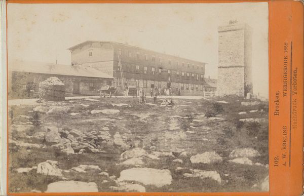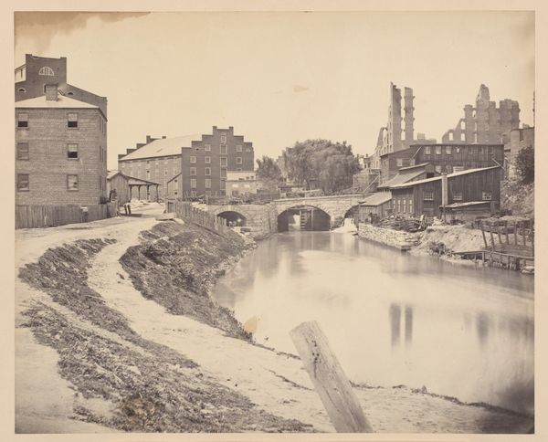 Curator: This gelatin silver print, dating from about 1852-1854, is entitled "Gezicht op de Oranje-Nassau-kazerne in Amsterdam gezien vanaf de garancinefabriek," or "View of the Orange-Nassau Barracks in Amsterdam from the garancine factory," by Eduard Isaac Asser. It's quite remarkable for its early photographic treatment of the urban landscape, isn't it? Editor: It strikes me as profoundly still, almost desolate. The monochrome palette contributes, of course, but it's the geometric precision, those rigid lines of the barracks mirrored in the water... it speaks to a sense of order, or perhaps imposed order. Curator: Precisely! Asser’s process here is key. Early photography demanded long exposure times, which accounts for the still water and contributes to the almost hyper-real clarity in the buildings. Consider the garancine factory's role; it provided the chemical base—alizarin, derived from madder root—for red dyes used in textiles. These dyes would've been essential to clothing the burgeoning population, even soldiers in the barracks, thus depicting interlocked systems of production and living in the developing city. Editor: Yes, but aesthetically, that barracks looms, almost suffocating the frame. The textural interplay of the rough-hewn lumber in the foreground versus the rigid geometry of the building provides such striking contrast. Also, notice how Asser guides our gaze – that subtle blurring around the edges concentrates attention right where he wants it. Curator: It is intriguing how these new barracks contrast to an adjacent older structure that would be related to production. Here we see a literal before-and-after playing out; industrial growth coupled with a militaristic one is becoming normalized as progress in society. These materials – silver halides suspended in gelatin – literally embody this historical transition, enabling us to visualize Amsterdam’s shift from manufacture to centralized authority. Editor: The scale feels deliberate, not just to showcase architectural detail, but perhaps even to emphasize the sheer mass and repetitive form that almost prefigures minimalist aesthetics. I am reminded of some stark landscapes and structural images by Bernd and Hilla Becher. Curator: Perhaps this gelatin silver print becomes almost sculptural? By immortalizing an environment facing transformation by both market pressures and labor strategies, it prompts contemplation. Editor: I appreciate that shift in perspective. The interplay of structure and reflection...it transforms into an engaging conversation long after the photographic process is done.