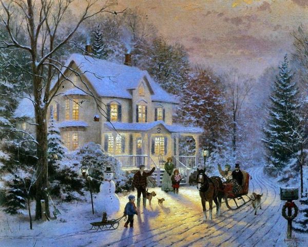 Thomas Kinkade made this painting, "Christmas Evening", without telling us exactly when or with what, but I'd say it was probably painted in the late twentieth century using oil paint on canvas. The way the whole scene glows is really something, isn't it? I feel the warmth, the light from the cottage windows and lamplight, the way it bounces off the snow, creating this sense of comfort and safety. Look how he builds up the texture with layers of paint, especially on the snow-covered bushes and the roof of the cottage. Each dab and stroke seems carefully placed to catch the light, creating a shimmering effect. And that little snowman standing guard outside the cottage! There's something both innocent and strangely melancholic about him. His simple presence reminds me of the ephemeral nature of things, the way beauty can be fleeting. Kinkade's work reminds me a little of Maxfield Parrish, another artist who was fascinated by the play of light and shadow. But where Parrish was interested in creating fantasy worlds, Kinkade seems to be reaching for something more sentimental, a longing for a simpler time.