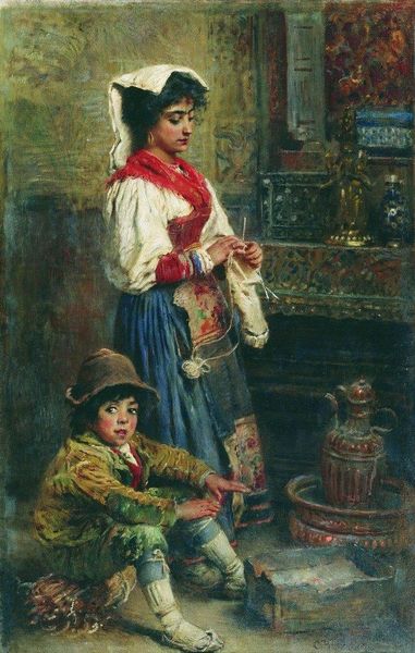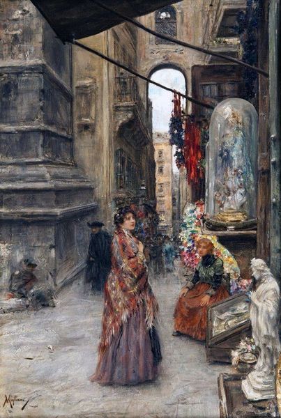 Vincenzo Migliaro painted "Conversation" using oil on canvas. Oil paint is an interesting medium, made by suspending powdered pigments in drying oil. In this case, Migliaro applied it in a loose, sketch-like manner, indicative of the *macchiaioli* style that was popular in Italy. If you look closely, you'll notice how the visible brushstrokes and unblended colors give the scene an immediacy, as if capturing a fleeting moment in the lives of these women. One carries a woven basket, filled with wares, suggesting the labor and trade that defined their world. There is nothing particularly precious about these materials, which adds to the accessibility of the scene. This everyday subject matter is a reminder that art isn't just about grand historical narratives, but also about the often-overlooked stories of ordinary people and their daily existence. Migliaro's choice of materials and techniques invites us to consider the social and economic context that shaped the lives of these women.