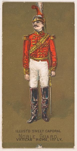 Curator: What a striking image! This print, dating from 1888, is part of a series issued by Kinney Tobacco Company. It's titled "Sergeant, 3rd Gatling Battery, National Guard of the State of New York" and was used to promote Sweet Caporal Cigarettes. Editor: It’s like a flash of crimson on cardstock! I immediately key in on the intense reds of the sergeant’s uniform – they are impossible to ignore, grabbing the eye and hinting at the bravado, perhaps even the intensity, expected of him. Curator: Precisely! Kinney Brothers relied on this bravado to promote the Sweet Caporal brand, embedding patriotism, duty, and sophistication. If you purchased this particular cigarette, the association communicated suggests "status." But the print is more complex; consider how the sharp rendering conveys the weight and texture of the wool uniform. Editor: The detail for such a small piece! But the reliance on line and blocks of color really flattens the space. See how the figure is rigidly posed and frontal. I do detect the effort to portray him naturalistically in his military bearing – but ultimately, I perceive that this artwork has to prioritize representation within tight pictorial conventions rather than truly seeking naturalism. It’s not unlike many contemporaneous mass produced goods that rely upon clear signals rather than subtleties to gain rapid purchase with viewers. Curator: That's a smart read, and I completely agree with your interpretation. Notice that the use of linear elements adds visual definition. They give shape to forms that also denote volume – as evident by observing how various textures form in and through these methods: fabric’s sturdiness alongside the sheen emanating from metals; also noteworthy would-be color distinctions amongst surfaces reflecting the nuances presented throughout various terrains encountered during expeditions/engagements. What does the overall image communicate? Editor: The figure has a very stoic, very stiff air that borders almost caricature-like, particularly with the mustache…It does remind me about past empires during sunset…A time steeped in tradition mixed now with emerging anxieties about modern identities…A time of both pomp but still, fragility Curator: Absolutely! The portrait freezes him at that precise historical juncture: an intersection among worlds…One wonders about the kind of narratives the buyers conceived, with one breath clinging at ideals but facing shifting foundations… Editor: An evocative, albeit somewhat frozen, echo, preserved between shades within colored cardboard!