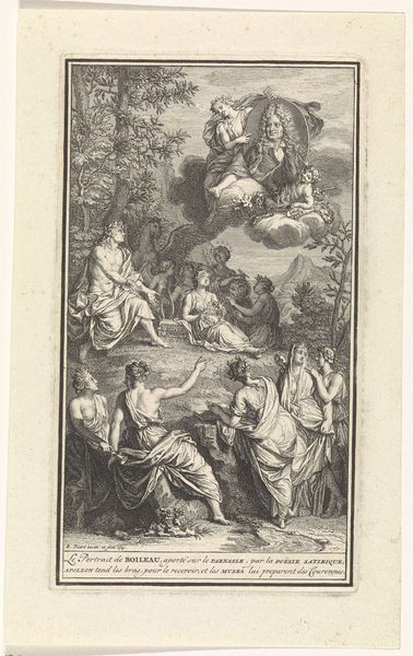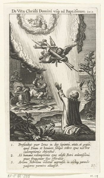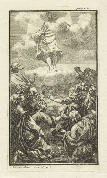 Editor: So, this engraving, "Hemelvaart van Christus" or "Ascension of Christ," was created in 1797 by Reinier Vinkeles. Looking at the figures below, there's a strong sense of awe, even disbelief. What social narratives were in play during this time period? Curator: That’s a very perceptive initial reading! I think considering the rise of Enlightenment ideals and secularism, even while religious beliefs still held significant cultural power, helps us contextualize this piece. Vinkeles, working within a baroque aesthetic, creates this incredibly theatrical moment. Editor: The theatrical element really stands out. It’s not just a religious scene; it’s a performance of power and devotion. What can this tell us about the relationship between art, religion, and social control at the time? Curator: Precisely! Art was often a tool to reinforce dominant ideologies. Ask yourself, how does the engraving depict Christ’s body, and what message does that send to the largely subjugated populace? Think about who is included in the scene and who is left out, or rather, not deemed worthy to be included. Editor: That’s interesting. Christ is very luminous, almost ethereal, physically separated from the others below. It reinforces a hierarchy. Curator: Yes, and considering the political turmoil of the late 18th century, you can almost see the engraving working to reassert traditional order, through very specific gender and class representations. Do you see any gestures or expressions which reinforce certain roles, particularly in relation to faith and obedience? Editor: Now that you mention it, those kneeling or reaching upward seem to embody the ideal subservient subject. That wasn't something I originally observed. Curator: Seeing the ascension through the lens of power dynamics changes how we read the image, doesn't it? Editor: Absolutely. It makes me think more critically about the narratives that are being presented and for whom. Thanks so much! Curator: Likewise. Remembering that artworks exist within layered contexts—political, social, economic, gender—opens so much to new perspectives on visual imagery.