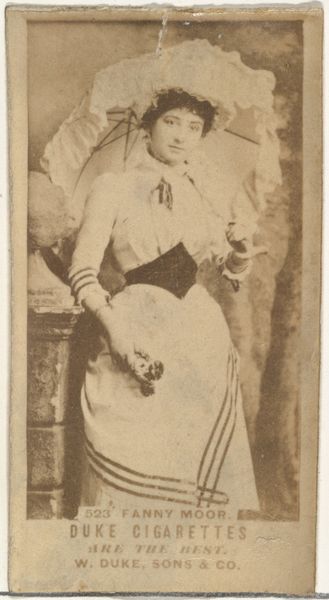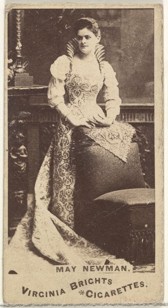 Curator: At The Metropolitan Museum of Art, we have a trade card dating back to the 1880s, originally issued by W. Duke, Sons & Co. to promote Cameo Cigarettes. It's part of the "Actors and Actresses" series and this one is titled "Card Number 312, Mlle. Le Celaur." Editor: My immediate reaction is that there's a strange tension between the delicate impressionistic style of the rendering of Mlle. Le Celaur, and the banal cigarette advertisement stamped at the bottom. It’s as if two distinct realities collide here. Curator: Absolutely. The contrast tells us so much about the values of that period—commodifying beauty and talent so blatantly. Images of actresses were essentially symbols of aspiration and sophistication. Their widespread distribution democratized access to that symbolism, even while reinforcing social hierarchies. Editor: Precisely! Structurally, observe the strategic use of lace—layer upon layer, visually implying depth and richness. Semiotically, these details equate to bourgeois aspirations cleverly deployed to elevate the cigarette brand through association. Curator: And I see, in her slightly averted gaze, the archetypal coquette. She’s aware of being seen but retains a level of detachment. The pose is iconic – the ‘courtesan’ foot elegantly positioned, suggesting refinement while subtly hinting at accessibility. Her image becomes a collective fantasy, packaged and sold. Editor: Note also the photographer’s use of soft focus and subdued sepia tones. The textures seem intentionally blurred, almost dissolving into one another. This effect mimics impressionistic paintings and romanticizes her form in this era before sharp photography. Curator: Yes, it's less about precise likeness and more about evoking a feeling—a sense of idealized beauty, or perhaps a yearning for a different lifestyle for people purchasing what's considered the "best cigarette". Editor: It's a study in contrasts, visually and conceptually, leaving us with the impression of beauty meticulously manufactured for consumption. Curator: Leaving us to question what those historical echoes say to a modern audience viewing those very techniques and symbolic structures being redeployed every single day.