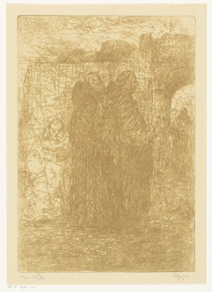 Editor: This is Odilon Redon’s "Faust and Mephistopheles," created around 1880, using charcoal. The figures emerge from this dark, almost oppressive space. There's a distinct contrast in the way each figure is rendered, one seemingly tormented, the other… observant. How do you interpret this work? Curator: Redon offers a stark visual commentary on power dynamics, wouldn't you agree? Consider the positioning. Mephistopheles is grounded, his gaze direct, almost accusatory. Faust is ethereally situated, his bowed head indicative of shame or despair, potentially. Given the sociopolitical contexts of the late 19th century, could this be a critique of societal pressures or an exploration into the darker aspects of human experience? Editor: I hadn't considered the societal critique, I was more focused on the literary source. Do you think the choice of charcoal reinforces this interpretation? It seems such a fundamental, almost primal medium. Curator: Absolutely. Charcoal, with its capacity for deep shadows and subtle gradations, mimics the complex ambiguities of moral choices. Redon’s symbolic use of chiaroscuro underscores the ethical grey areas inherent in Faust’s pact. Think about the Symbolist movement; how did they try to deal with feelings that were floating around European Society? How do they reject positivism and embrace subjectivity? Editor: So, rather than a literal depiction of Goethe’s tale, it’s more about Redon using those characters to examine contemporary issues through a psychological lens? Curator: Precisely. It's an invitation to confront uncomfortable truths about agency, accountability, and the seduction of power – ideas that continue to resonate powerfully today. Editor: This makes me see the drawing in an entirely new light! Curator: Excellent! That is precisely what engaging with artwork should do.