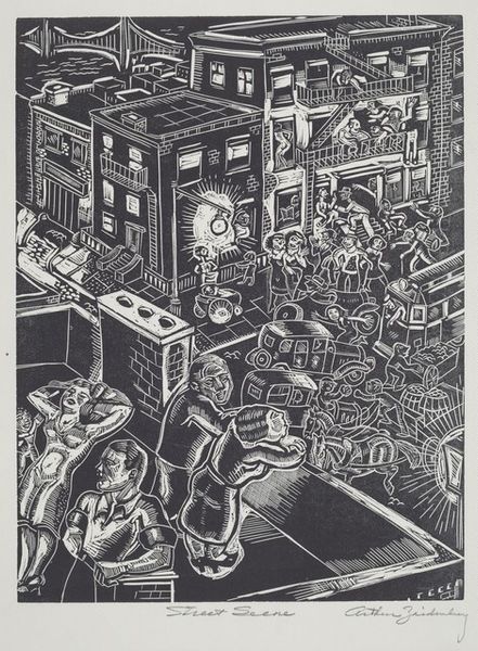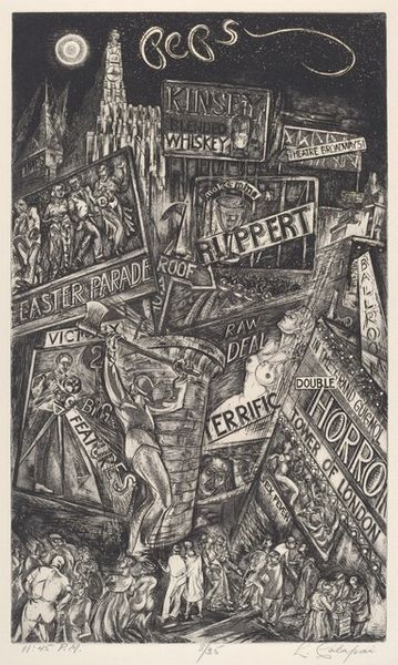 Anne de Kohary's ‘Bowery Street Corner’ is a black and white print, its hard lines giving a sense of a moment captured in time. It’s interesting how de Kohary uses a range of greys to create depth, giving the viewer a glimpse into the bustling street life. The material quality of the print is evident in the crispness of the lines and the way the ink sits on the paper, suggesting the precision involved in the printmaking process. Look closely at the figures in the foreground; the way de Kohary renders their posture, hunched and weary, tells a story of hardship and resilience. The contrast between the dark shadows and the bright signage above creates a dynamic interplay, drawing the eye upwards. This piece reminds me of the work of Jacob Lawrence, who similarly used stark lines and bold compositions to depict urban life and social realities. Both artists engage with the complexities of the human experience, inviting us to reflect on the world around us and the stories it holds.
