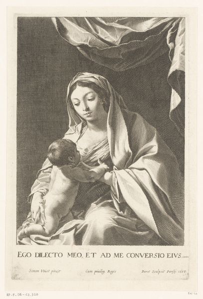 Nicolas Pinet created this print, "Maria met kind in bloemenkrans," using engraving techniques. Notice how the composition is structured around contrasting textures and forms. The soft, flowing lines of Mary's drapery and the delicate petals of the floral wreath encircle the solid, rounded forms of Mary and the Christ Child. This contrast isn’t just visual; it invites reflection on the symbolic binary oppositions between the earthly and the divine, the temporal and the eternal. The halo above their heads, a conventional signifier of holiness, is rendered here with a subtle radiance that draws our eyes to the serene facial expressions. Pinet employs a semiotic system, using recognizable visual symbols, which invites us to interpret their deeper cultural and religious meanings. The image's symmetrical arrangement gives a sense of balance and harmony. However, this harmony could also be seen as a way of reinforcing traditional religious values, reflecting how art can both express and reinforce cultural norms.