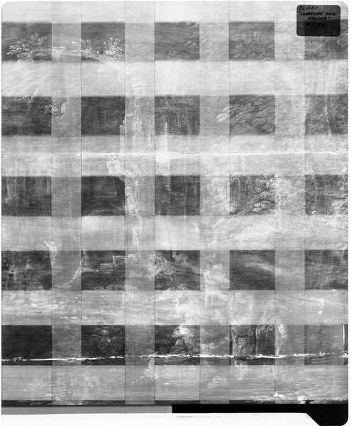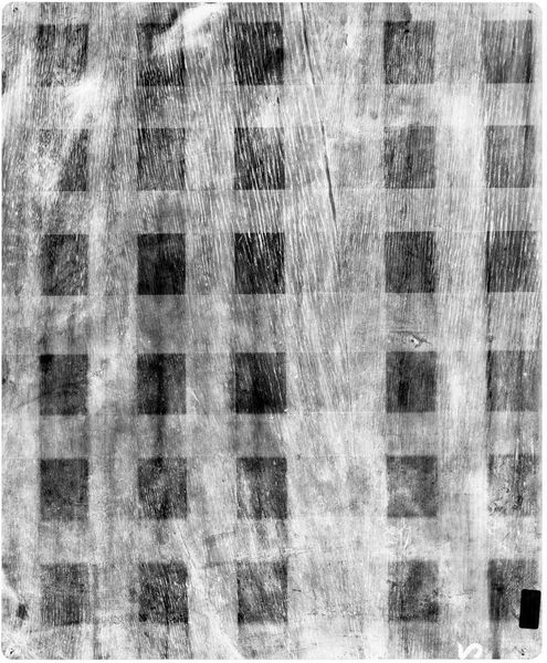 Curator: At first glance, this X-radiograph appears abstract, almost like a minimalist grid. Editor: Indeed, but it is actually an X-radiograph of the painting "Seascape, the Wreckers", by Simon de Vlieger, held at the Harvard Art Museums. Looking closely, we see beneath the surface. Curator: And what a revealing surface it is! This technique exposes the layered history—the underpainting, the artist's revisions. One can almost feel the artist grappling with the composition. I see echoes of maritime disasters, shipwrecks, and the symbolism of human vulnerability against the power of nature. Editor: It's fascinating how technology allows us to peel back the layers, not just of the paint, but of artistic intention and perhaps, even the cultural context of its creation and subsequent preservation. Curator: It makes you consider the life of an artwork—its visible face and the secrets it keeps. Editor: And how our understanding evolves with new tools of observation.
