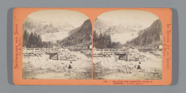 Editor: We’re looking at “Rivier met op de achtergrond Alpen landschap,” River with Alpine landscape in the background by Achille Quinet, dating to around 1860 to 1880. It’s an albumen print. There’s a kind of sepia wash over everything that feels really nostalgic and distant, almost dreamlike. What strikes you about this work? Curator: Well, this isn't just any snapshot; it's a crafted vision of nature, a landscape seen through the romantic lens of the mid-19th century. What do you feel when you look at those towering mountains softened by the hazy light? Editor: A sense of scale, definitely, but also a kind of tranquility. It's grand but somehow peaceful. Curator: Exactly! Quinet captures that feeling of awe inspired by nature. He's using the very latest photographic technology. You’ve probably noticed it's a stereo card? Editor: Yes, a stereograph. It feels like early VR, trying to trick the eye into seeing depth. So, this image was mass-produced? Did people collect these? Curator: Precisely! Think of these as the postcards of their time. People were hungry for images of the world, and the Alps held particular allure. Did you notice anything else, perhaps where your gaze falls first? Editor: Definitely drawn to the river, because of the composition. The converging lines really pull your eye. It’s so calm; I could almost step right in. It’s not just documenting a place, but crafting an experience, like theatre or an old photograph found in your attic. Curator: I concur completely. Editor: It is an extraordinary journey to delve into 19th-century visual culture.
