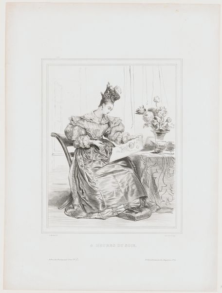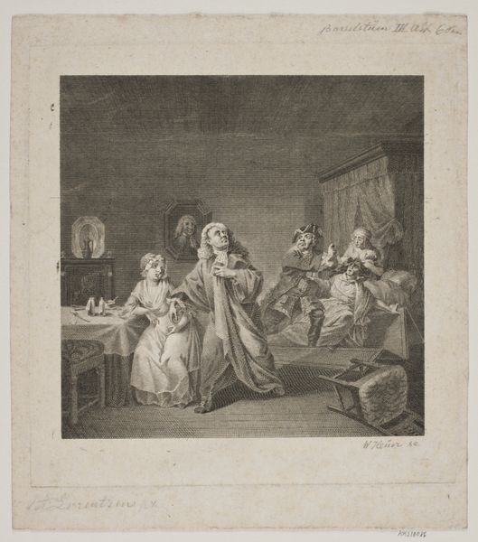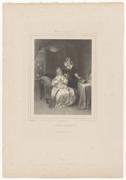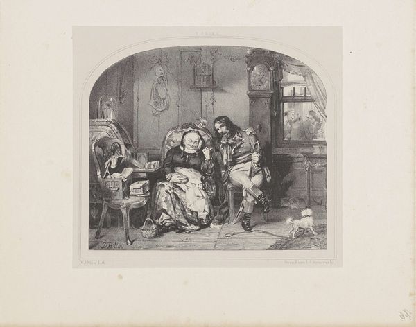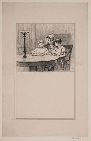 This undated work entitled "Twee mensen aan tafel" or "Two People at a Table" was created by Herman Frederik Carel ten Kate. Born in the Hague, Ten Kate dedicated himself to paintings of historical events and genre pieces. Here we see a domestic scene where class distinctions play out in subtle ways. The setting and dress of the figures suggest a middle-class existence, yet there is a sense of unease. The woman sits with her arms crossed, a picture of restrained melancholy, while the man seems distracted. A young girl stands nearby, perhaps a daughter, observing the scene with an inscrutable expression. The print invites us to consider the complexities of 19th-century bourgeois life. It depicts a silent world in which social expectations, gender roles, and unspoken emotions shape interpersonal relationships. The artist encourages us to reflect on how societal structures influence the personal dynamics between people, inviting both recognition and perhaps, a quiet disquiet.