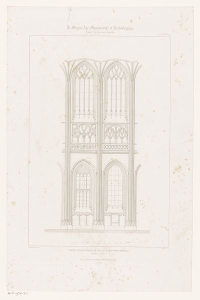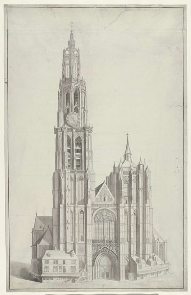 Curator: I'm struck by the drawing’s aspiring, almost unsettling height, like a gothic finger pointing to the heavens. Editor: This is Wenceslaus Hollar’s "Ontwerp voor de toren van de Sint-Romboutskathedraal te Mechelen," dating from 1649. Currently held in the Rijksmuseum, it presents an intricate vision in ink. What interests me is the sheer labor involved. This wasn't a quick sketch, but a meticulously rendered plan, an attempt to visualize and potentially influence monumental construction. Curator: And how it visually communicates ambition, really – the symbolic climb towards divine connection. Each level of gothic detailing seems to add to this symbolic accumulation of piety and civic pride. Does it tap into a shared cultural longing, do you think? Editor: Absolutely. These gothic structures functioned as significant employers in the late Medieval and early modern era. The production of materials—stone, glass, metals—and the organization of skilled labor forces involving masons, glaziers, and other specialized crafts workers sustained local economies, reflecting a society deeply invested in material expression of religious and social values. Curator: I wonder about the missing top, that incomplete finish… Does it point towards unfulfilled dreams or perhaps the shifting fortunes of religious institutions in that era? Is there some inherent meaning embedded in this imperfection? Editor: Interesting you mention that – I see a reflection of process. It showcases an architect's work as both a visual concept and a material endeavor, subject to social and economic realities. Its incompleteness provides a unique opportunity to study the intentions and potential realization. Curator: So true. It feels less like a finished piece and more like a historical artifact capable of triggering endless questions. It has this remarkable aura of historical yearning, doesn't it? Editor: Indeed. Examining these artistic decisions gives us some visibility into cultural production practices and related forms of capital—economic, social, or symbolic—during a particular period, and the lasting legacy of these traditions.