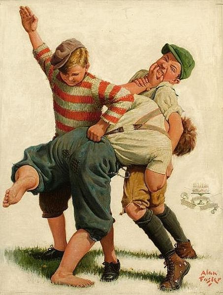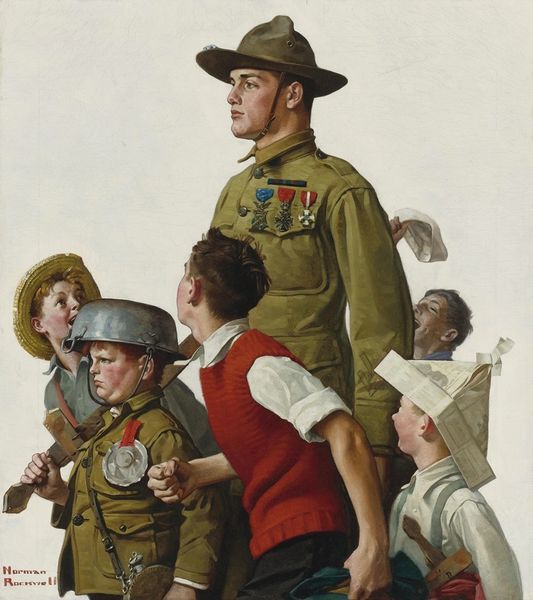 Curator: Hello! Editor: Hi there. This is "Vacation!" by Norman Rockwell, painted in 1919. It looks like an oil painting depicting three boys celebrating the end of school, but with very different reactions. The kid in the middle looks so free and joyful, while the one on the right seems...not so happy. What strikes you about this painting? Curator: Well, immediately I'm interested in exploring the narrative around boyhood and social class it seems to touch upon. Notice the composition - the boys are almost presented as types, right? We've got what looks like the privileged student on the right, and on the left maybe a representation of more rural roots, set apart from the central figure’s display of freedom. What stories do you think Rockwell is hinting at here? Editor: That's interesting! I hadn't really considered it in terms of social class. I mostly focused on their individual personalities shining through, that contrast in reactions to the same event. It's quite impactful, visually. Do you see any specific details that speak to these social divides? Curator: Certainly! Consider the clothing - the boy on the right is very formally dressed; there's an almost theatrical elegance that sets him apart, his face nearly scowling as he struggles with his books, his burdens. This sartorial symbolism clashes intensely with the bare-footed, tousled figure on the left. And consider what might have been the impact of the first World War just concluding; does this contrast amplify a sentiment that systems of the older generation and education were not the goal for everyone, but instead, that an idealized vision of a childhood summer awaited these figures of innocence? Editor: That’s such a great way of thinking about it, really zooming out to the context of the era. Now, when I look at the painting, it seems more complex than just a simple happy "end of school" scene. It brings more gravitas to Rockwell’s social commentary, doesn't it? Curator: Exactly. Seeing these tensions adds a layer of complexity. Art can be a really potent mirror reflecting, and sometimes even challenging, societal norms. Editor: That's amazing! Thank you so much for this perspective. I will definitely consider it in my future analysis.