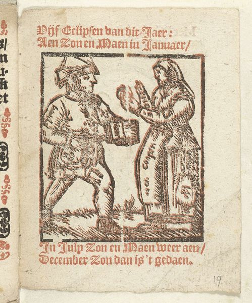 Curator: Erhard Reuwich created this woodcut, "Twee Ethiopiërs," around 1486-1488. Its fascinating to consider the medieval world's emerging view of different cultures and people, presented through this printed image. Editor: My first impression is that despite its small size, it has an incredible depth of texture, achieved by the crosshatching. But why “Ethiopians” when the inscription speaks of the inhabitants of the Indies? Curator: The titles and the imagery reflect the evolving and often confused European understanding of faraway lands during this period. What Europeans conceived of as Ethiopia and what they thought of as India at that time weren’t quite what we understand those terms to mean today. This reflects the narratives of exploration and discovery which, naturally, shaped public understanding. Editor: I’m particularly drawn to the figures' gestures; they're both posed with open hands as if presenting themselves, or perhaps offering something. One holds a curious object in his hand: Do you have any idea what that could symbolize? Curator: Those gestures, though meant to signify openness or a state of being depicted, could have very well been intended as representative of either offering welcome or perhaps soliciting. Their clothing and the object in hand also function as status symbols within a broader social narrative of identity and the "exotic." Editor: You’re right. And the visual language, especially the crosshatching you pointed out, really does underscore this sense of… “otherness” doesn't it? It reminds us of woodcuts depicting biblical figures or moral allegories. Is Reuwich appropriating a well-known visual rhetoric here, using this visual shorthand to indicate far off places and populations? Curator: Precisely. The visual vocabulary plays a significant role in constructing a narrative around these unfamiliar populations. It underscores the tension between observation, fantasy and political intentions inherent in the cultural understanding of the "other." This demonstrates how an image participates in social practices as an apparatus to power and other ideological projects. Editor: It’s so compelling to realize how even something seemingly straightforward like a print, can contain such a rich mix of curiosity and social coding. I find that dichotomy extremely affecting. Curator: Indeed. When we engage with artworks like these, it offers us insight into both history and ourselves and our perception of the historical roots that led to contemporary society and our cultural diversity.