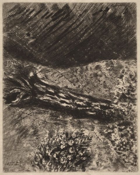 Curator: Mariano Fortuny Marsal created this intaglio print, titled "Dead Kabyle," in 1867. It’s a somber piece, wouldn't you agree? Editor: Yes, incredibly somber. The stark contrast between light and shadow, combined with the subject matter, evokes a powerful sense of loss and stillness. There's something about the figure being shrouded, yet vulnerable, that really stays with you. Curator: Fortuny made this print during a period of significant colonial expansion by European powers into North Africa. Understanding this context, the image gains a complex historical and political weight. Editor: Exactly! How does it reflect the era's perception and representation of colonized peoples? I'm immediately questioning the power dynamics inherent in a European artist depicting the death of a Kabyle man. Was it meant to be an objective study, or something else entirely? Curator: That is very perceptive. We need to analyze the motivations behind the piece's creation. This falls into a complex tradition of Orientalist art. "Dead Kabyle" reveals both artistic skill and potentially problematic ideological underpinnings linked to power, colonialism, and representation. Editor: The intimacy of the scene is striking, yet there’s distance. Notice how his face is concealed? It depersonalizes him in a way. That candlestick and plate seem out of place. It reduces him to an object, part of a still life, devoid of individuality. We must interrogate this depiction! What narrative does Fortuny create, and for whom? Curator: It’s interesting how the realism clashes with that romanticizing effect. His visible bare feet add another dimension, rendering the figure both relatable and utterly foreign. Perhaps it attempts to bridge a gap, even unsuccessfully, or even dangerously so. Editor: Definitely. There is no single interpretation; instead, it's a piece that prompts deep reflection about how death and cultural identity are visualized within a context of inequality. Curator: By considering this artwork through both historical context and a critical contemporary lens, we can encourage visitors to engage actively with issues of representation and cultural power dynamics. Editor: I’d agree completely. "Dead Kabyle" remains a potent and provocative image, encouraging important dialogues on history, representation, and the continuing legacies of colonialism.