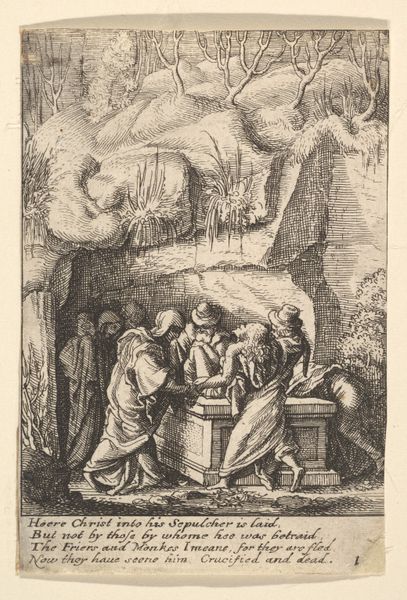 Curator: Here at the Rijksmuseum, we have on display "Spreuken van Salomo, rechterdeel," or "Proverbs of Solomon, Right Part," an engraving and etching by Gerard de Jode, likely made between 1547 and 1591. My initial impression is one of meticulously rendered details—the cross-hatching giving shape and form in a stark, but delicate way. Editor: I'm immediately struck by the duality. The men examining something below while above and behind them, almost separate from them, is a landscape containing a deer drinking water. It evokes both careful observation and a somewhat detached perspective. Curator: I see that duality too, particularly through the lens of water symbolism. The foreground depicts figures, presumably examining an object beneath the surface of a body of water in what looks to be a reflecting pool, suggesting a dive into something deeper—perhaps wisdom, mirroring the title referencing Solomon’s proverbs, famous for containing wise judgements on earthly matters. Water has a tradition of symbolism. From birth and creation, water is usually associated with cleaning and spiritual renewal. Editor: Yes, that contrast between the literal scrutiny and the implied symbolism is compelling. Formally, de Jode uses a limited palette, relying on the varying density of line work to suggest depth, texture, and light. There's a wonderful push-and-pull created by the perspective, drawing us in. Look at the strong, structural use of linear patterns along the body of the rectangular well-like basin: very compelling and geometrically sound for a small-format work. Curator: The deer, though small in scale compared to the foreground figures, becomes powerful. Deer have carried various spiritual significances across cultures and generations and continues into modern times. Drinking water signifies the quenching of spiritual thirst—suggesting both men could be thirsting for and even gaining greater awareness of something more than just earthly matters. The artist seems to use these dualistic figures to represent all levels of creation from humanity to animal. Editor: The formal arrangement emphasizes that link too—it suggests a continuous flow. The hard lines create geometric volume to one side, as an artistic container of wisdom itself, and this contrast to the openness of nature that gives space and depth to the forest. Curator: Thinking about how cultural memory and continuity are conveyed through visual symbols like these, what stands out to me is the accessibility of the wisdom—presented almost like something attainable, reflective, or to be discovered rather than passively received. Editor: And for me, considering the structural composition and how de Jode’s graphic vocabulary makes visual meaning, it’s a great reminder of how much information can be conveyed through careful observation of details like perspective and light.