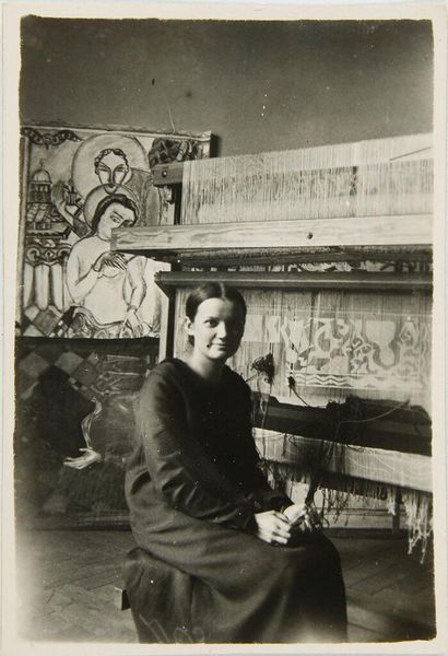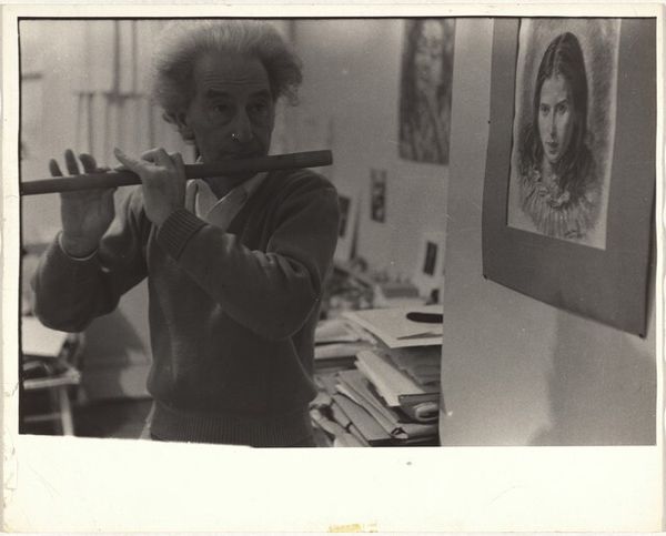 Editor: Robert Frank's gelatin silver print, "Man playing flute--San Francisco," from 1956, has such a quiet and contemplative mood. The subject is central, framed tightly, and the gray scale enhances that sense of serenity. What visual elements stand out to you most? Curator: Initially, the geometric framework is quite compelling. The horizontal lines of the flute juxtapose with the stacks of papers and art arranged around him. And, of course, the man is placed geometrically within that setting, both framing the chaos and grounded within it. Do you observe that it's his posture, really his entire attitude, that allows all this to coalesce? Editor: Yes, he seems very present. Like he's making sense of everything in front of him, the order, the chaos, all the shapes, through the act of playing music. Curator: Precisely. Note how Frank utilizes light and shadow to sculpt the planes of the face, emphasizing the subtle textures that suggest maturity, contemplation, lived experience. It’s not just a photograph of a man, but a study of texture, tone, form, and being. The backdrop itself mimics his creative act with many canvases scattered on the floor; do you find his calm pose in line with this environment? Editor: Definitely, it feels less like a portrait and more like Frank is making a statement about art, environment, and even being present, as if he and the musician have figured something out together and translated that onto film. Curator: The photograph's inherent tensions resolve through Frank’s eye and skillful construction, which elevate it from mere documentary to a poignant meditation on the act of creation. It's about seeking to capture a pure emotional experience. Editor: I hadn’t considered the compositional intention to be this intricate, thank you. I find it exciting how form impacts narrative. Curator: Agreed. There are many things here beyond documentary, as it uses an elevated semiotic language. It shows how our response relies on our structural interpretations.