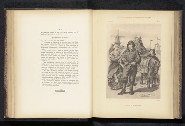 Editor: Here we have a reproduction of a print of a wedding in Zeeland, dated before 1883, by Emile Aubry. It has a certain antiquated feel, perhaps evoked by the linear style of the engraving itself. What catches your eye, what do you see here? Curator: Immediately, I'm drawn to the symbolic weight of the wedding procession itself. Processions, particularly weddings, often embody community hopes and collective identity. Notice the faces. Editor: They’re not very detailed. Curator: Exactly! In this era, and presented in print form, that actually reinforces a sense of shared experience and identity, it could represent any wedding, anywhere. Think about how this imagery resonates with ideas of regional pride and cultural continuity. Do you see anything in the way they are travelling? Editor: Well, they're in a carriage. Is the floral arrangement that unusual stick the driver is carrying significant? Curator: It certainly is! It points to continuity. In folk tradition, flowers are symbols, fertility emblems, luck tokens and more. Here the artist depicts a bride and groom travelling away together in this formal style with the objects. They are building and sustaining shared meanings of togetherness. It's more than just transport, it's a symbolic departure and cultural performance, wouldn't you say? Editor: I see what you mean. Considering the era and the artistic style, it’s about an idea rather than just a depiction of an actual wedding. Curator: Precisely! The collective memory and cultural weight imbue the artwork with profound meaning, far beyond the individuals involved. We find new connections. Editor: This has really given me a new appreciation for how even seemingly simple images can be rich with cultural significance. Curator: And hopefully this has opened another window for us to understand that world!