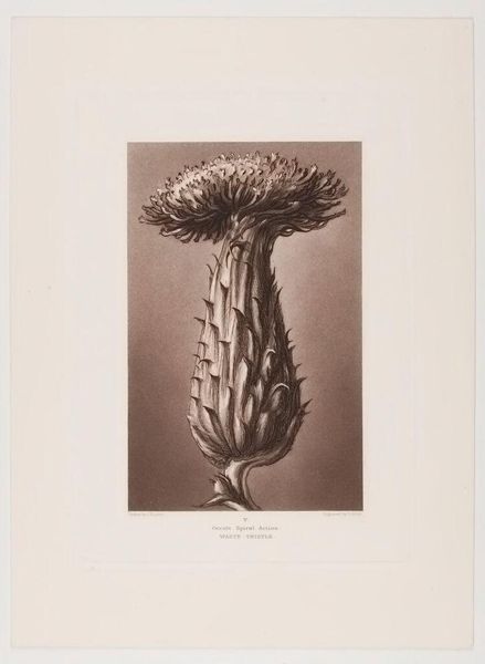 Editor: Here we have Karl Blossfeldt's gelatin silver print, "Art Forms in Nature 84" from 1928. It looks like an artichoke in full bloom, but somehow more… architectural. I feel a curious blend of the natural and the constructed. What do you see in this piece? Curator: Well, it's funny you say architectural, because I immediately thought of gothic cathedrals! Think about it: the upward thrust, the intricate details... Blossfeldt saw the potential for ornamentation in everything, echoing the Art Nouveau interest in nature's geometry. The photo isn't just a depiction; it’s almost an allegorical statement about inherent design. Do you find it sterile, this almost clinical approach to nature? Editor: I see your point about the gothic architecture – the upward reach is so prominent. Sterile? Perhaps a bit... but I think the stark black and white adds a sense of timelessness. Like a preserved specimen. The level of detail is quite amazing, really. It's more about reverence than cold observation. Curator: Yes, reverence is a better word! It’s a window into a whole world of tiny universes contained in a single organism. For me, it's the inherent rhythm and the complex beauty laid bare through Blossfeldt's lens that continues to enthrall me. These photographs allowed him to share, to teach – a radical pedagogical approach! Editor: I hadn't considered the teaching aspect so directly, but that makes complete sense given the clarity and focus. It definitely encourages a closer look. Thanks! Curator: My pleasure. Each encounter reveals new facets, right? That's the magic of art, isn’t it? Always inviting you to reconsider and discover anew.