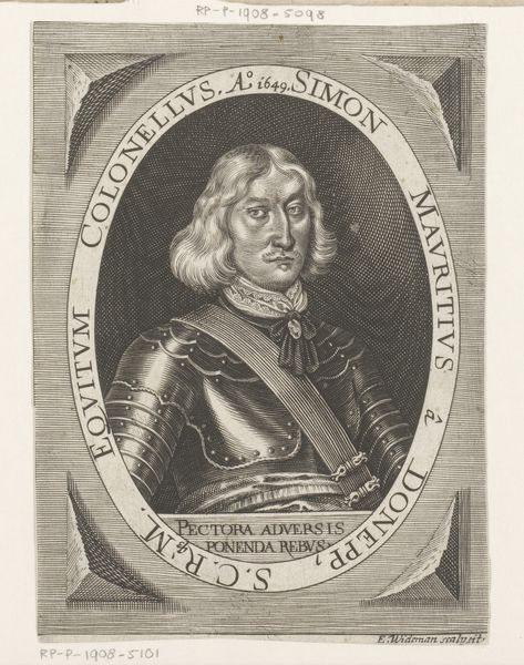 Curator: Here we have "Portret van Federico Colonna," a baroque engraving by Camillo Cungi, dating roughly from 1597 to 1649. What strikes you initially about this print? Editor: There's a certain melancholy in his eyes. And, given the rigid formality, it makes me think about power – the weight and burden of leadership. I mean, just look at the detail of the armor...the symbols must reveal so much. Curator: Indeed. Armor, in such portraits, typically serves to legitimize power through a lineage of martial prowess, vital for aristocratic identity and claims to territory. Here we have Colonna, the Neapolitan magnate depicted at perhaps the height of the Baroque era when personal imagery merged dynastic projection and, crucially, political communication. Editor: That baton or staff he's holding feels very deliberate. What does that signify in a context such as this? It’s much too simple to be merely decorative. Curator: Likely, it denotes authority. Though lacking ornamentation such as eagles or crests common to scepters, the starkness speaks more plainly to command, especially crucial to impart at the time given struggles for power both within Italian aristocratic circles, and amidst constant pressure from external forces. Editor: And consider the oval frame – practically a shield itself! Plus, the inscription. I wonder how this circulated in its time, what audience it intended to reach and influence? Curator: As a print, multiple impressions could be made and disseminated to those close to the family or kingdom as emblems of patronage, allegiance, as well as a personal expression to Colonna and Cungi’s artistic talent at the time. It encapsulates the interplay of visual communication in maintaining social status and aristocratic power. Editor: Knowing now about its circulation, this shifts the way I perceive it! Not just a depiction, but carefully plotted messaging. Each choice tells a story about that era and Colonna's self-image. Curator: Exactly. Hopefully, you all will agree as you carry on through this gallery to examine just how art and society were intertwined.