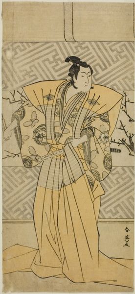 Curator: This woodblock print is titled "The Tea Stall - Kagiya Osen" and was created around 1769 by Suzuki Harunobu. Its long, narrow format immediately strikes me. Editor: I find its delicate composition immediately charming, yet imbued with an unusual stillness. Curator: Let's examine the context. Ukiyo-e prints such as this one were often made using multiple blocks, each for a different color. Consider the level of craftmanship needed to create this image from individually carved blocks. We see this beautiful grey fabric with its unique swirling pattern, an incredibly detailed element to transfer by hand onto wood. Editor: The formal arrangement here is fascinating. Observe how Harunobu uses the verticality of the print to elongate the figure, accentuating her graceful pose, her gaze lowered in contemplation. The artist masterfully plays with positive and negative space, notice the architecture as a series of receding planes to add depth and subtle asymmetry. Curator: Absolutely. The narrative element is equally compelling. Osen, the tea server, gained quite some fame through these prints. Note how, even reproduced, her celebrity contributed to a consumer culture of sorts. This image itself became a commodity, consumed widely by those eager to own a piece of Osen's celebrated persona. Editor: But beyond Osen's commercial appeal, consider how Harunobu employs light and shadow to sculpt her form and her subdued coloration allows for nuanced expressions and the overall ethereal mood. Curator: It is fascinating to reflect on how the consumption of art, such as this print of Osen, mirrors larger societal dynamics concerning the commodification of beauty and labor during that era. Each print produced and distributed serves as a trace of cultural interaction and economic exchange. Editor: Agreed. It serves as an exemplary lesson in mastering subtle visual poetics. Curator: Looking at this artwork through the lens of its materials and production truly adds depth. Editor: Indeed. It certainly enhances our appreciation of how these formal elements and the overall aesthetic contributes to the charm that "The Tea Stall - Kagiya Osen" still exerts on its viewers.