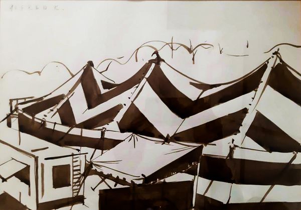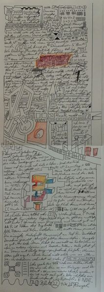This drawing, created in 2019 and 2020 by Armin Andreas Pangerl, presents a complex layering of geometric shapes and handwritten text. The monochrome palette of black ink on paper emphasizes the stark contrasts and intricate details within the composition. The shapes of the buildings and figures, as well as the text, create a sense of frenetic energy. The overlay of architectural forms and ambiguous figures evokes a sense of spatial disorientation. Gridded lines intersect and overlap, disrupting any conventional perspective and challenging fixed meanings. The semiotic system of signs and cultural codes at play are subverted, revealing the drawing to be an exploration of inner thoughts. The juxtaposition of different scales, lines, and textual elements suggests an attempt to destabilize established categories of representation. Ultimately, Pangerl’s drawing functions as a site of ongoing interpretation, inviting viewers to question the nature of perception and knowledge.