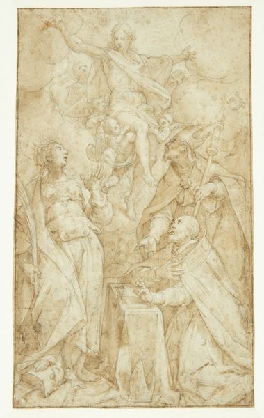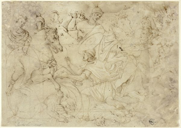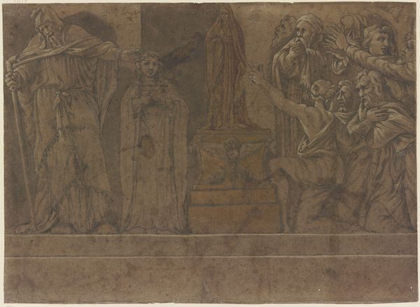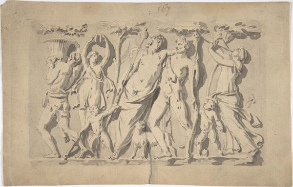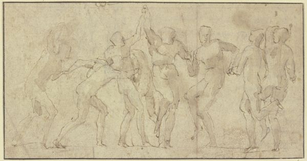 Curator: Before us is "Procession," an ink drawing on paper created around the 16th century by Andrea Boscoli. It currently resides here at the Minneapolis Institute of Art. Editor: My immediate impression is one of carefully orchestrated movement. The sepia tones and the relatively compressed space contribute to the sense of a tightly knit group advancing, almost deliberately, from left to right. Curator: Indeed. Boscoli's piece showcases the Mannerist style with its exaggerated forms and dynamic compositions. Considering the likely patronage for this work, we can think about the ways historical paintings depicted processions to assert power and order. Editor: I'm captivated by the deliberate rendering of each figure, all variations on the human form, but slightly elongated. The almost theatrical poses enhance the rhythmic cadence that one can sense here, in the slight differences from figure to figure. Curator: Precisely. When observing similar historical portrayals of power, especially when figures move from one place to another, a viewer has to consider that there were real life displays which also had cultural and political meanings. Boscoli then distills the drama of public performance for a select, privileged audience. Editor: This restrained use of ink also draws my attention. The layering creates areas of relative darkness, which emphasize select body parts while still creating depth with hatching strokes. What seems on the surface to be simple lines are really sophisticated formal maneuvers that highlight gesture. Curator: Considering its context—Boscoli's piece presents an intriguing intersection of artistic license and social representation that allows us to think about history as a continuum. The piece isn't simply recording a real event but is communicating the values associated with historical identity. Editor: Looking at it again, one can appreciate the piece as a study in movement. Its value comes from those artistic choices rather than only from its record of what happened. It pushes our perspective of form, guiding us towards more profound modes of vision, wouldn't you agree? Curator: Ultimately, reflecting on the sociopolitical lens through which art gets produced helps reveal complex and multilayered ideas of self-making and mythmaking during a crucial historical juncture. Editor: Very insightful. These interwoven elements show how this drawing exemplifies a beautiful unity between idea and execution, inviting new appreciation of a period both aesthetically rigorous and creatively charged.