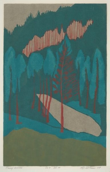 Editor: This is Hulda D. Robbins's "Hidden Path," a watercolor print from 1949. The subdued palette creates a somber, almost foreboding atmosphere, don't you think? What do you see in this piece? Curator: The title, “Hidden Path,” immediately sparks my interest. I see more than just a landscape; I see a coded representation of access and exclusion. The colors are muted, somber, but perhaps reflective of the period’s anxieties or even a personal lament. The "hidden path"—for whom is it hidden, and why? Is this landscape inviting or impenetrable, and for which viewers? What sociopolitical concerns might Robbins be hinting at? Editor: That's an interesting angle. I hadn’t considered that the landscape could be interpreted politically. The title made me think more literally about nature trails. Curator: Right, but we must always look beneath the surface. Who historically has access to land, and who does not? The post-war era saw rapid social changes and challenges to established norms. Robbins, as a female artist, was undoubtedly navigating these shifting landscapes herself, both literally and metaphorically. Is there a connection between the suppression of women artists at the time, and how that's related to ideas around restriction or denied passage? Editor: I see what you mean. Perhaps the ‘hidden path’ alludes to opportunities denied because of one's identity? Curator: Exactly. What appears as a serene landscape becomes a subtle critique. Editor: That gives me a lot to think about, considering the time period and how landscape art might serve as commentary on broader societal issues. Thank you! Curator: And for me, your fresh perspective reminds me how each generation brings new and valuable insights to art historical analysis.