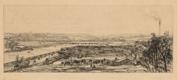 Maxime Lalanne created this etching, The Porte de Versailles at Pont du Jour, using a metal plate, acid, and ink. Etching is an indirect process. The artist covers a metal plate with a waxy, acid-resistant coating, then scratches an image into the coating, exposing the metal. When the plate is dipped in acid, the exposed lines are eaten away, creating grooves. The plate is then inked, and the surface wiped clean, leaving ink only in the etched lines. Finally, the plate is pressed onto paper, transferring the image. This method, born from the metalworking trades, was embraced by artists for its precise linework and reproducibility. The fine lines create a scene of Paris's fortifications, a layered landscape reflecting both military engineering and urban life. Consider how Lalanne’s mastery transforms industrial materials into art, bridging the gap between craft and fine art traditions.