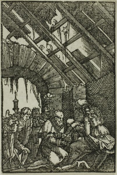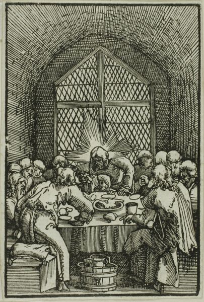 Curator: Altdorfer's woodcut, "The Last Supper," presents a familiar scene with stark lines. The small size highlights the intense labor involved in its creation. Editor: It's quite claustrophobic, isn't it? The hatching creates a sense of being enclosed, almost trapped, in this final moment. Curator: Woodcuts like this were relatively inexpensive to produce and distribute, making biblical scenes accessible to a wider audience. Editor: And the architectural details, that window especially, seem to box the figures in, amplifying the tension. How does the material—the wood itself—influence our understanding? Curator: The act of carving the wood is key. Each line, each mark, is a direct result of Altdorfer's hand and labor, bringing a human element to this divine narrative. The prints circulated broadly. Editor: So, mass production of religious imagery allowed for a democratization of faith, pushing against institutional control? It's a powerful commentary, embedded in the grain. Curator: Exactly. This woodcut makes one think about the social function of reproducible images during the Reformation. Editor: This has given me a fresh perspective on the social impacts of art production and how it facilitates the spread of religion.