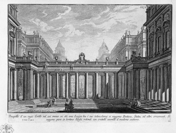 Curator: This etching, attributed to Giovanni Battista Piranesi, depicts a grand, imagined "Room Use of the Ancient Romans with Columns and Niches Adorned with Statues." What strikes you about it at first glance? Editor: The sheer scale. And the starkness of the lines! It's impressive but also feels… austere, almost clinical. The deep shadows heighten the feeling of a theatrical, if somewhat lifeless, stage. It looks like a modern design despite it's antiquity! Curator: Indeed. Piranesi, though working in a neoclassical style, often infused his prints with a dramatic flair. Notice how the meticulously rendered architectural details—the columns, the niches filled with statues—all serve to create a sense of overwhelming power and the authority of ancient Roman aesthetics. It speaks to a desire for grand narrative that transcends identity. Editor: You're right, it is the means of constructing this idealized image of the past that really fascinates me. The line work, while precise, doesn't aim for pure realism. There's a clear focus on capturing form through controlled labor that idealizes Roman design. This attention to form overshadows its implied use by those figures scattered on the steps—who feel quite detached. Curator: Precisely! The human figures almost seem like afterthoughts. The perspective and dramatic composition overwhelm them and hint at themes of power, cultural memory, and the seductive pull of idealized history. This work acts almost as a manifesto for architectural possibility, echoing the philosophy of the period and the potential of classical ideals within contemporary political movements. Editor: I see it more as commentary on production. By rendering this space as a detailed, reproducible etching, Piranesi commodifies Roman grandeur. The act of printing allows to democratize and sell the notion of the architectural grandeur—though divorced from the lived experience of the average Roman. Curator: Interesting point. That commercial angle reveals further how this echoes ideas surrounding access, taste, and cultural ownership—who gets to write history, and what does that history ultimately look like? This image isn't just about the space; it reflects contemporary society's ideas about what Roman antiquity was meant to be. Editor: I agree. For me, it becomes an interesting artifact revealing our shifting relationship with architectural representation. Curator: Exactly, that's why exploring these contextual nuances helps to enrich our understanding of art and culture and their role in our broader story of society. Editor: Indeed. By really emphasizing materiality and method of construction, this also sheds more light on our consumption of aesthetics.
