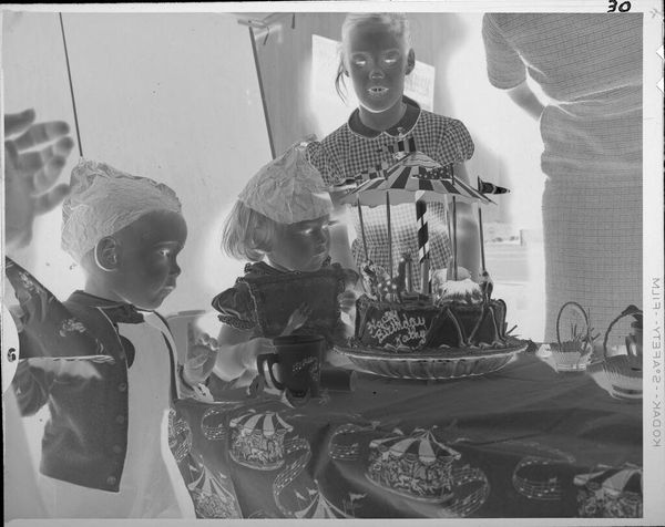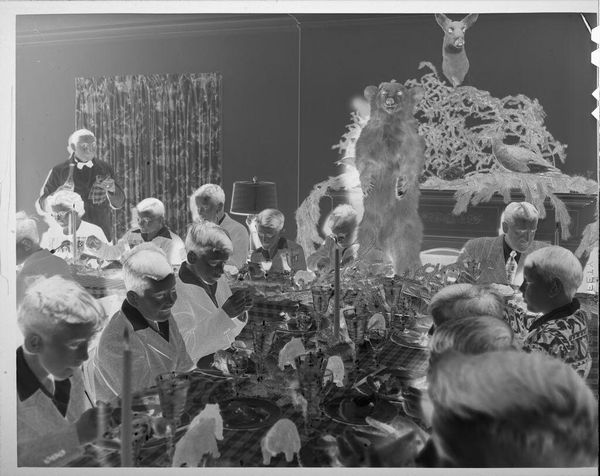 Editor: This is an untitled photograph by Martin Schweig, it seems to capture a golden anniversary celebration with people gathered around a table and piano. It gives off such a nostalgic, almost dreamlike quality because it’s a photo negative. What strikes you about it? Curator: It whispers of bygone eras, doesn't it? The inverted tones lend a ghostly feel, like peering into a collective memory. I wonder about the choice to present it this way, like the artist wants us to look through the surface. Maybe the fleeting nature of time? What do you think? Editor: The ephemerality makes sense. It’s like looking at a faded photograph, so you know time has past. Curator: Precisely! It transforms a simple snapshot into something more profound, a meditation on memory, presence, and absence. It really asks us what it means to celebrate a life!