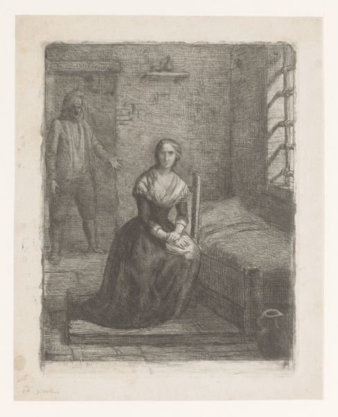 Curator: This is "The Prayer," a charcoal drawing made by William Morris around the 1860s. What’s your initial response to the work? Editor: Somber. It's overwhelmingly dark. The composition seems centered around this kneeling figure and the standing man with the raised face—but everything else recedes into the shadows. Curator: It's true that Morris often explored religious themes during this period, aligning with broader Victorian interests. Think about the social emphasis on faith and moral uprightness at the time. The choice of subject is, in itself, telling. Editor: Absolutely. The way he manipulates charcoal—smudging and blending it creates this really muted and atmospheric quality. The stark contrast between light and shadow gives it a potent, almost spiritual aura. Curator: Yes, it invokes that mood, but also the power dynamics present. A figure is kneeling, subordinate. The male figure is presented as interceding. Note how that relates to prevalent patriarchal structures. Editor: You know, beyond the thematic, there’s just the visual weight of the vertical column in the composition, dominating the right side. How the diffused light spills through at the top of the arch. Curator: Good point. Morris’s interest in medievalism also comes into play. The setting feels deliberately archaic, reinforcing a sense of timeless morality but it’s rooted in specific cultural norms. How does the image itself engage in this dialogue between morality and power? Editor: Perhaps the subdued nature is its most profound choice. Restrained yet evocative. Curator: I think understanding the broader social narratives in which this piece participates enhances that perception. Editor: Agreed. Viewing it from both the visual and historical aspects really shows William Morris' complex interplay.