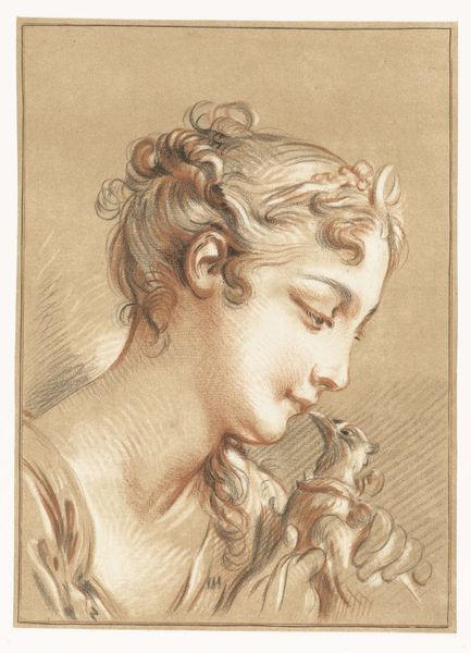Curator: Here we have Gilles Demarteau's "Hoofd van een meisje," likely created sometime between 1756 and 1776. It’s a delicate drawing executed in pencil and charcoal. Editor: It has an almost ethereal quality. The tones are soft, and there's a gentle, dreamlike feeling to it. I’m immediately drawn to the texture; I can almost feel the grain of the paper and see how the charcoal settles. Curator: Notice the profile. It evokes classical portraiture, reminiscent of Greco-Roman sculpture. Demarteau was working in a time that embraced Rococo aesthetics, a sort of embrace of antiquity. The delicate features, the carefully arranged hair – it all contributes to this idealized vision of femininity. There’s an innocence in her expression. Editor: It’s interesting to think about the paper itself. Where did it come from? How was it made? Pencil and charcoal weren't simply pulled from thin air, it takes labour and a degree of resource extraction. And Rococo was only possible on the back of so much unseen labour. I can imagine that she perhaps never labored at all. Curator: It's certainly possible to interpret her pose and gentle features as symbols of purity and upper-class leisure. Rococo art was definitely about capturing the ephemeral beauty and privilege of the elite, but perhaps she signifies a time of impending change. It’s right before the Revolution. Editor: It also makes me consider the physical process of drawing, the repetitive marks, and the building up of tone. Look at the hatching along the neck - very carefully considered use of resources, even then. It reminds you of the act of creation itself. Curator: Considering the symbols in the composition, she might have symbolized a shift, and just like the French, our subject has had her fair share of changes since being immortalized by Demarteau. Editor: Thinking about it from this angle brings a lot more resonance for me. What initially appeared merely pretty, actually becomes somewhat reflective on the conditions of its creation, and perhaps its own precarious survival.