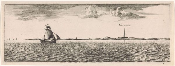 Editor: This print, titled "Gezicht op Delft en De Lier" after 1666 by Joost van Geel, depicts a tranquil seascape with distant city views. The texture achieved through the engraving, particularly in rendering the water, is quite striking. What stands out to you in this composition? Curator: I am intrigued by the stark contrast between the detailed foreground, occupied by the boats, and the more generalized rendering of the cityscape in the background. Notice how the artist utilizes line and perspective to create depth, drawing the eye from the detailed waves to the faint silhouettes of Delft and De Lier. The formal arrangement prompts a fascinating study of figure-ground relationships. Editor: I see what you mean. The texture in the water feels almost separate from the buildings on the horizon. Why would the artist make that kind of a choice? Curator: Precisely! One could argue that van Geel prioritized an exploration of texture and line, relegating the geographical specificity of Delft and De Lier to secondary importance. Are the boats not the primary subjects, acting as vehicles for experimenting with line and creating visual interest? Editor: So, you’re suggesting it’s less about depicting those cities, and more about using them as elements in a larger formal exercise. That shifts my understanding. I was so focused on it being a landscape that I neglected that balance in form. Curator: Consider, too, the composition's balance; the deliberate placement of the sailing vessels contributes significantly. What impact would a composition lacking those forms impart on you? Editor: Hmm, that would really flatten the image. With the sail, and a scattering of smaller boats the water is allowed to "ripple". Okay. I think I see your formalist stance now. It's really interesting how this perspective opens up an entirely different conversation about this Dutch Golden Age print. Curator: Indeed, understanding how formal elements contribute to a work of art is a foundational exercise.