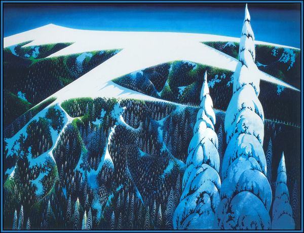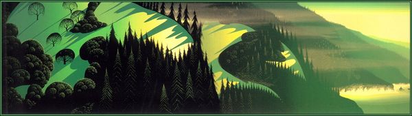 Eyvind Earle created this image of an Evergreen Forest using serigraphy. Observe how the sharp, pointed shapes of the evergreen trees evoke a sense of upward movement, reflecting a connection between earth and sky. This motif of trees reaching upwards has long been a symbol in various cultures—the tree of life, the cosmic tree—linking the earthly realm to the divine. Consider, for instance, the ancient Nordic Yggdrasil, a vast tree connecting the nine worlds, or the Christian symbolism of the cross, originally a tree, representing sacrifice and redemption. These symbols have been culturally absorbed and live in our collective consciousness, expressing a profound sense of longing. Even here, the evergreen forest becomes a modern echo of humanity’s enduring quest for something beyond our immediate grasp. The psychological impact is a palpable sense of aspiration and perhaps, a touch of melancholy. The image engages our senses, inviting introspection as it explores the cyclical nature of symbols across time.