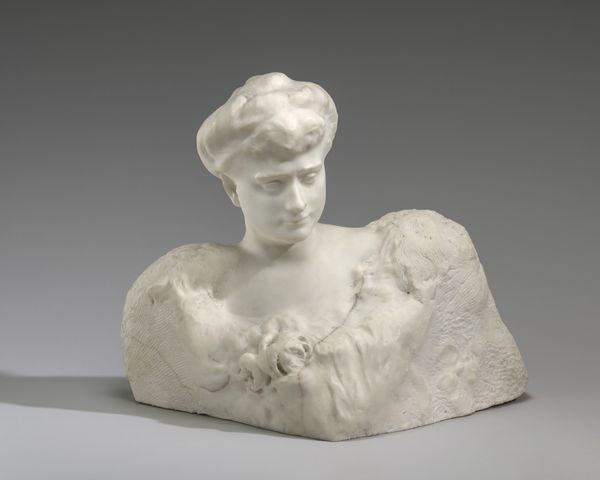 Editor: Here we have Rodin’s marble sculpture, "Victoria Sackville-West, Lady Sackville," created between 1913 and 1914. It’s a captivating portrait, isn't it? It strikes me as contemplative, almost melancholic. What captures your attention most in this work? Curator: Melancholy is a good word for it. The rough texture of the marble gives a sense of immediacy, as though Rodin just stepped away, doesn't it? Her gaze is introspective, like she's carrying secrets in the gentle curve of her lips. Editor: Absolutely, that impasto finish does make it feel so fresh. Do you think the texture contributes to the emotion that comes through? Curator: Undoubtedly! The unfinished quality brings us closer, making it less about idealized beauty and more about capturing a fleeting moment of raw emotion. Look how the shawl cradles her form, almost protective, suggesting both vulnerability and resilience. What story does that tell you, do you think? Editor: I hadn't considered the shawl's protective aspect. It now seems less about covering and more like shielding. It brings out this idea of internal strength, that she is going through something. Curator: Precisely! It transforms the reading of the portrait. Perhaps Rodin sensed that duality within her. These imperfections and open narratives are really what Rodin was interested in portraying. Editor: It’s incredible how much nuance he could convey with marble and this approach to texture. I never considered how much information you could take from how "unfinished" it feels. Curator: Indeed. The magic lies in how Rodin transformed inert stone into a vessel brimming with human emotion. And for me it encourages us to think more broadly, not to just see art, but to feel and interact with it.