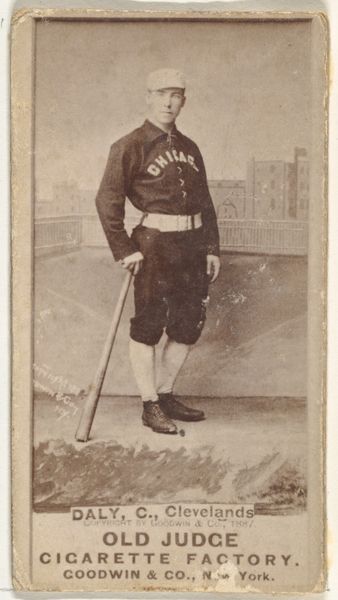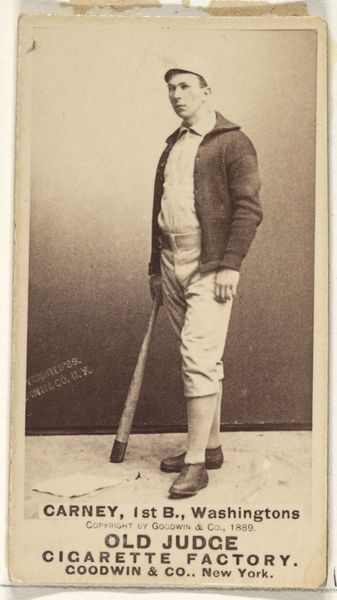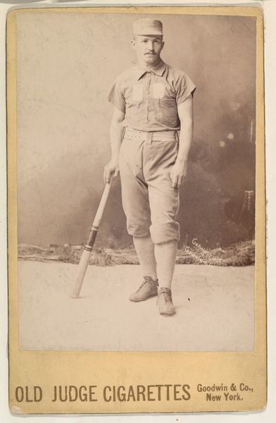 Curator: Here we have a collotype from 1887 entitled "James Francis 'Pud' Galvin, Pitcher, Pittsburgh, from the Old Judge series (N172) for Old Judge Cigarettes." Goodwin & Company created it as part of a larger advertising campaign. Editor: I love the sepia tones; there's a stillness to it, a real sense of bygone days. The baseball bat looks almost like a walking stick, so polite! Curator: The collotype printing process allowed for mass production and distribution. Images like these were essentially trade cards packaged with cigarettes, incentivizing collection and, of course, consumption of the tobacco products themselves. Editor: It's wild to think about smoking and baseball being so tightly linked in popular culture. Looking at the portrait, Galvin's pose with his hand on his hip...he just looks like he owns the diamond. And the little tie knot he's wearing--so dignified for the ballfield! Curator: Exactly. We see a deliberate construction of the athlete's image for consumption and commercial gain. His attire--the jacket over the uniform--contributes to this air of respectability, associating the baseball player with middle-class values to market not only Galvin, but the cigarettes themselves. The material composition, thin paper, reinforces its consumable, throwaway nature. Editor: I never think about the smallness of things like this, but now all I see is a symbol of our brief lives on this Earth. Even the corner is curling with a history you can almost smell...faintly smoky, of course! Curator: In short, these weren’t meant to be displayed in museums, but in pockets or discarded after use. The ephemerality is key. Editor: Still, someone cared enough to save it and now here it is for us to ponder. Funny, isn't it? Curator: Indeed. And to think about all of the labor involved to bring these materials to market--to manufacture the photographs and baseball, to grow the tobacco, to run the presses. Editor: I am always drawn in when old materials remind me to really slow down and consider the bigger picture!