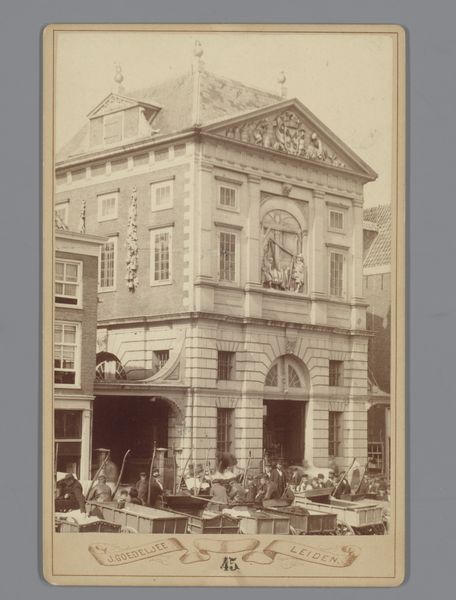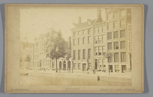 Editor: Here we have a photograph, "Gezicht op het voormalige kantoor van Jacob Ankersmit en Café La Poste in Amsterdam," created sometime between 1860 and 1880 by Gebr. van R. The sepia tones lend it a somewhat nostalgic and perhaps even melancholic air, like a forgotten corner of history caught on film. What do you make of this street view? Curator: You've picked up on that sepia's song alright. It does whisper of times gone by, doesn’t it? What strikes me is the contrasting architecture, the 'Café La Poste' building practically jostling shoulders with its more imposing neighbour. One whispers "community", the other hints at civic muscle, maybe a little governmental gravitas. Imagine the conversations those walls could have! What kind of stories do you think unfolded there, then and now? Editor: That's a wonderful thought. I guess I hadn't considered the human element quite so deeply. I was focused on the purely visual aspects. Now that you mention it, there is also this small table with two seats... waiting for a customer? Curator: Exactly! See how that small detail starts to fill in a wider story of human connection. The geometry is there too, that street is practically bisecting the frame in two sections. I'd say the real charm here lies in the balance—between public and private, imposing grandeur and unassuming homeliness, wouldn't you agree? It is as if two halves complete a chapter of life back then. Editor: I see that now! Thanks for opening my eyes. Curator: Anytime, it seems even the buildings agree!