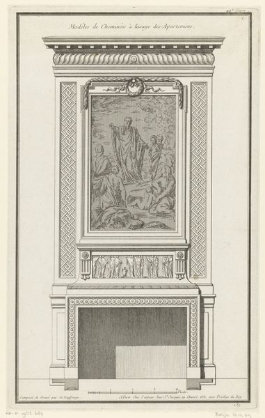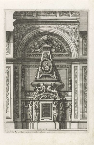 Editor: So, this engraving, "Tabernacle with the Lamentation of Christ," made by Jean Lepautre between 1666 and 1693… It feels so architectural, almost like a stage. The print *shows* a stage. What strikes me is the way the artist combines the drama of the Lamentation with the rigid structure of the tabernacle itself. What do you make of it? Curator: The visual language here is fascinating. It’s an engraving *of* an engraving, or an architectural drawing of one, that itself contains an image dense with Christian symbolism. Consider the arch above—the cross, the cherubs—they frame the scene of mourning below, adding layers of meaning to the depicted suffering. Editor: So, the tabernacle itself acts as a kind of… symbolic container for the emotional content of the Lamentation? Curator: Precisely. But Lepautre’s choice to render it as a print, an easily reproducible image, also speaks to how grief, particularly religious grief, circulates within a culture. Each element serves as a mnemonic device. Look at the empty altar front. What does it remind us of? Editor: That feels like a space for contemplation, a place for personal mourning or reflection inspired by the biblical scene. It prompts a response. Curator: Indeed. The cultural memory of the Passion is continuously reactivated through these visual symbols. Consider how the very act of recreating or reinterpreting traditional symbols affects their psychological power. Editor: That's powerful. It's interesting to think of how even the most rigid structures, like this tabernacle, can be vehicles for such intense emotion. Curator: Yes, visual culture enables a shared emotional understanding which both reinforces shared social experiences and helps build personal meaning. I notice more each time I see this image.