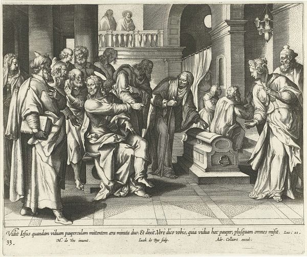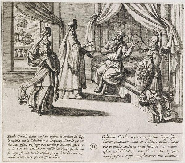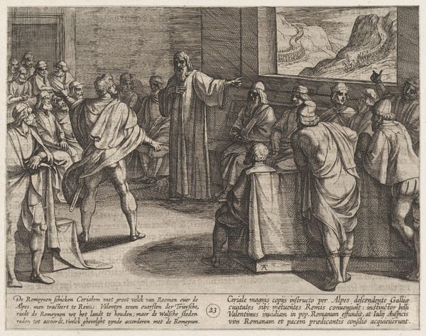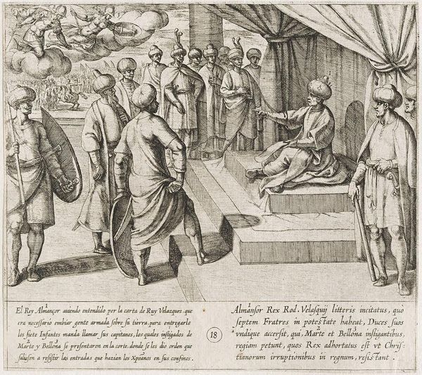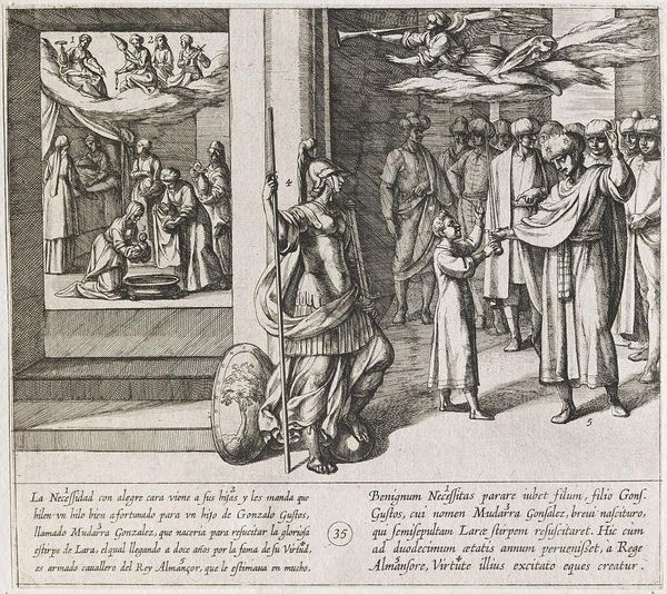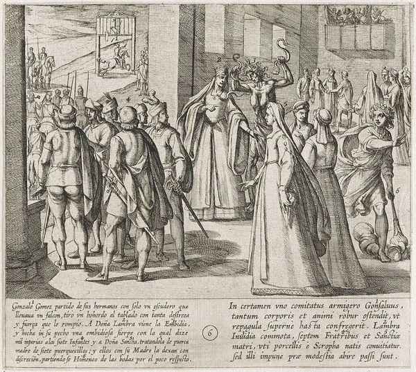 Curator: Here we have Antonio Tempesta’s engraving, "The Infantes Are Dubbed Knights by Conde Garci Fernandez." Editor: It's all sharp lines and angles, creating a very formal and almost stiff atmosphere. Curator: Indeed. Tempesta was quite adept at capturing the grandeur of such ceremonies. Consider the context: knighthood was a pathway to power and social mobility. Editor: I’m drawn to the material aspects of the printmaking process itself. Look at the fine lines; it showcases the skill and labor needed to produce such detailed imagery. Curator: And what these images circulated, they reinforced a very specific social order. The church, the nobility... Editor: But these prints were also relatively accessible, weren't they? Bringing elite imagery to a broader audience, perhaps challenging those social boundaries in their own way. Curator: A fair point. This print speaks volumes about the complex interplay between social class, artistic labor, and the dissemination of power. Editor: Absolutely, and through Tempesta's labor, we're still considering these dynamics centuries later.