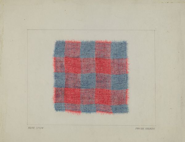 Curator: Alois E. Ulrich's watercolor drawing "Patchwork Quilt," from around 1938, captures a compelling example of textile art on paper. Editor: Immediately, I’m drawn to the stark contrast of the red cross against the muted, quilted squares. It evokes a sense of warmth amidst austerity. The frayed edges depicted around the entire perimeter are a stark reminder that the piece is unfinished or simply aging away. Curator: The visual language here points to both domesticity and tradition. Quilts have long functioned as a means of storytelling, commemorating events or preserving familial histories. It's as if Ulrich sought to capture a piece of communal memory within this image. Editor: I see that echoed in the geometrical forms, specifically the arrangement of the shapes to show how their interaction with one another reveals underlying formal structure. It is more complex than the humble quilt might lead one to believe; even the interplay between matte washes of color and precise lines is masterful. Curator: Indeed. Notice how the rendering, in watercolor on paper, paradoxically enhances the sense of tactile reality; the cross in the center could symbolize the intersection of family lineages or the confluence of generations sharing stories. Editor: Or simply the physical joining of disparate fabrics. The execution speaks of care and labor, which translates emotionally. And yet, it's presented with a disarming honesty; you see every stitch. Curator: Quilts were often made communally. Do you think this imagery also symbolizes shared stories or even social connections of community? Editor: Precisely. Although a mere simulacrum, it functions beyond the visual to evoke emotional connection. And from my formalist perspective, there's an elegant structure at play here, uniting disparate elements to compose an intentional artwork. Curator: Through Ulrich's piece, one gains insight into both personal experience and broader cultural practices. By capturing this common handmade object, Ulrich preserves and invites continued re-interpretation. Editor: Right. Beyond its material or composition, this image captures more. Through this careful analysis, both material and psychological understanding can provide powerful meaning that goes beyond the artwork.
