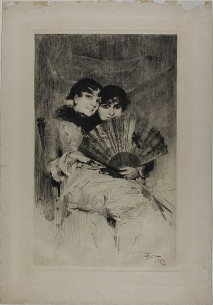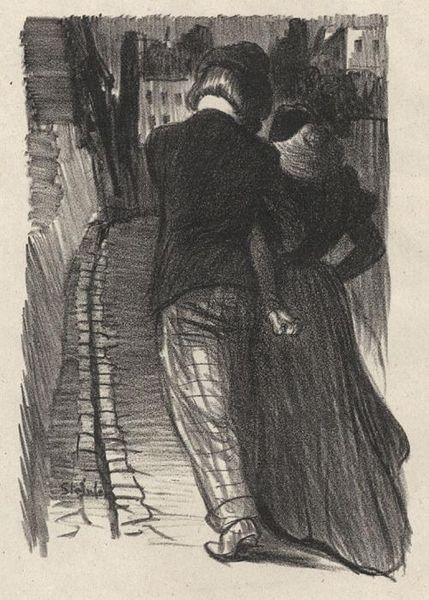 Editor: This drawing is called "Two Parisians," by Joan González. I'm really drawn to the contrast between the figures. What formal elements stand out to you? Curator: Observe how González manipulates tonal values. The figure on the left is rendered with dense, assertive strokes, creating a stark silhouette. Conversely, the figure on the right dissolves into a softer, more diffused form through lighter, almost ethereal shading. The composition, while seemingly simple, evokes a complex interplay between presence and absence. Editor: So, it's about more than just the depiction of two figures? Curator: Precisely. It's about the dialectic relationship between form and void, presence and absence, realized through meticulous manipulation of the medium. Editor: Thanks, I’ll definitely look at it with fresh eyes now! Curator: It's been a pleasure. The beauty of formalism lies in the layers it can reveal.