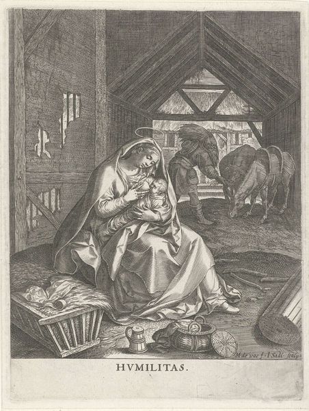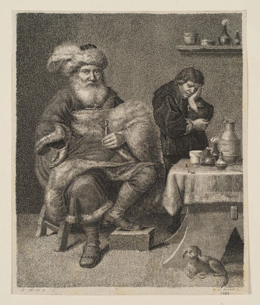 Curator: This is "Village Barber" by Jacobus Gole, housed at the Harvard Art Museums. Editor: It’s fascinating, almost unsettling. The textures are captivating, particularly the barber's peculiar hat and the child's expression. Curator: Barber-surgeons were common then; they weren't just cutting hair. This print speaks to the public's reliance on them for various procedures. Editor: Notice how Gole uses light and shadow to direct our gaze. The subtle highlights on the child’s face contrast sharply with the darker tones of the barber's clothing. Curator: Absolutely, and the composition places the barber in a position of authority, reflecting the socio-medical dynamics of the time. Editor: It's remarkable how the formal elements reinforce the narrative – a powerful blend of art and social commentary. Curator: Indeed, Gole captures a slice of life and reminds us how healthcare practices have evolved. Editor: I find myself pondering the expressions and the implied stories beneath the surface.