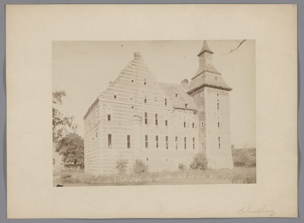 Editor: Here we have "Gezicht op Kasteel Schaesberg," taken sometime between 1890 and 1920 by an anonymous photographer. It feels like looking at a faded memory, the castle emerging from the mist of time. The rigid architecture juxtaposed with the soft, overgrown foliage is striking. What's your take? Curator: That’s a beautiful way to put it! For me, this photograph whispers stories of resilience and decay. The castle, once a symbol of power, is now embraced by nature. It’s like nature is slowly reclaiming its space, softening the rigid lines of human construction. Don't you feel the melancholic beauty of abandonment, a gentle reminder of the ephemerality of even the most imposing structures? Editor: Definitely. I see how the architecture becomes a stage for this narrative of time, which I find more intriguing than a perfectly preserved facade. Does the anonymity of the artist change your view? Curator: In a way, yes. It adds to the mystery. Knowing that it was taken by an anonymous photographer, perhaps even for documentary purposes, suggests an interest beyond artistic expression alone. It was a moment captured, almost incidentally, giving us a raw, unfiltered glimpse into the past. Makes me wonder what other forgotten treasures lie hidden in photographic archives. Editor: This makes me appreciate how even seemingly simple images carry these multiple layers. It has so much more beneath the surface. Curator: Exactly. Art, in all forms, isn't just about what you see but about the stories it awakens within you. Thanks, I learned something from you.