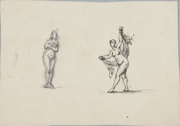 Curator: This delicate engraving is titled "Napolitaanse vrouw met opgetrokken rok," or "Neapolitan Woman with Raised Skirt," attributed to Baron Dominique Vivant Denon, circa 1787 to 1794. Editor: My immediate reaction is one of surprise, honestly. There's a boldness, a flaunting of convention here. Is it playful, or is there a more pointed commentary on the male gaze embedded? Curator: The era certainly lends itself to exploring layers of meaning. Denon was known for capturing intimate scenes. The raised skirt is not merely a depiction of nudity; it evokes complex socio-historical conditions within which erotic art was developing. The Neapolitan woman isn't simply an object. Her act can be perceived as defiant and knowing, particularly when understanding contemporary codes surrounding nudity. Editor: It raises so many questions about power dynamics and visibility. Consider the history of women being portrayed nude, especially within artistic contexts dominated by male perspectives. Does this image challenge or perpetuate that? Curator: It dances on a fine line, certainly. On one hand, it reflects the erotic interests common in the era, a reflection of the tastes of wealthy male collectors perhaps. The small print would have likely been for a private collection, to be shared amongst gentleman. Yet the woman's direct gaze, her pose… Editor: Yes, there's a gaze there that invites consideration. It disrupts simple objectification and suggests agency. I am curious what it meant for this woman. If her permission was requested. Or if she was at all a symbol for her own defiance in life? And yet her expression seems hidden...the details blurry. A detail possibly suggesting something as much about her actual lack of social status, as Denon's ability to portray her well. Curator: The style contributes to this tension, I think. It has hallmarks of Romanticism— a focus on emotion and subjective experience, as well as interest in ordinary individuals rather than grandiose heroic subjects. Yet at the same time, there is certainly nothing noble about this figure as an emblem of the Neapolitan landscape! Instead, Denon seems most interested in pushing the boundaries of how erotic subject matter can speak across political and class structures. Editor: It's definitely a fascinating piece to ponder. These details remind us that no image exists in a vacuum; it reflects social values, artistic trends, and deeply ingrained assumptions of the day. Curator: Exactly. Hopefully this conversation sparks greater awareness, pushing us all to examine imagery more critically.