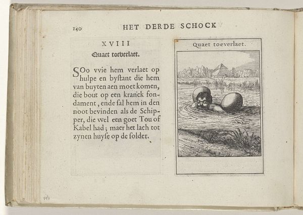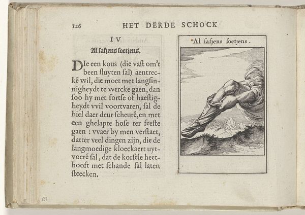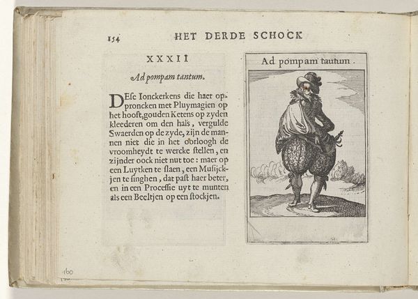 Editor: We're looking at "XXIV Het mist een Meester wel" from 1614 by Roemer Visscher, currently held at the Rijksmuseum. It’s an engraving on paper, part of a series, it seems. I'm struck by the darkly humorous mood—a fellow clearly down on his luck, flat on his back. What's your read on this? Curator: It's a delightful image, isn't it? Visscher’s "Emblemata" series were like visual proverbs. This engraving isn't just about a physical fall. Consider the context of the Dutch Golden Age; the emerging merchant class, the focus on trade, the anxieties about fortune… could it be a metaphor for economic setbacks? See the smoke from the chimney in the background—a touch of daily life contrasting with our acrobat's unfortunate position. Do you find the figure pitiable or comical? Editor: Comical, definitely! The turned-up shoes… almost like he planned to land like that. So, it's about more than just slipping on ice? It’s a social commentary? Curator: Precisely. The text beneath is key; these emblem books functioned much like early self-help guides. The message seems to be about resilience, picking yourself up after a fall – not just literally, but also in business, love, life! Did you notice the phrase 'It lacks a master, alright', implying a certain nonchalance or acceptance of this situation? Editor: I hadn’t fully grasped the connection between the image and text. Now I see, it’s a whole little drama! Curator: Exactly! It shows how popular culture used wit and visual cues to convey deeper meaning in everyday life. Editor: So, it's about the Dutch psyche itself, packaged in a funny little scene. I’ll never look at a simple engraving the same way again! Curator: Nor should you! The art of seeing is, indeed, the art of thinking.