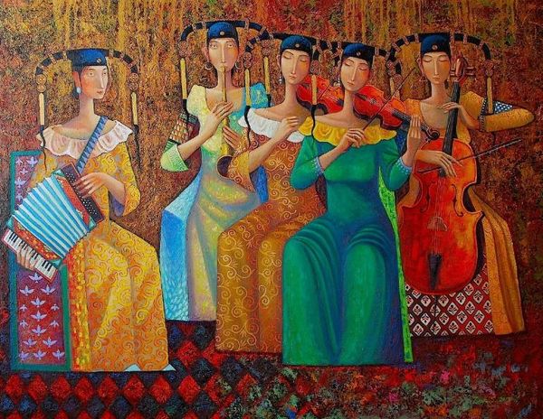 Curator: This vibrant piece is simply titled "Dance," and the artist known as Zaya worked with acrylic on canvas to realize it. What do you think initially? Editor: It’s certainly dynamic! The elongated limbs and the swirling composition, all set against that textured background... It almost feels like a celebration frozen in time, though a little melancholic due to the closed eyes and placid expressions. Curator: I agree about the dynamic quality. It is compelling when we consider Zaya's work within a broader socio-historical context. Think about art's role in capturing and often shaping cultural expressions of movement. Genre paintings, such as "Dance", capture fleeting moments and societal rituals, elevating everyday actions into statements about communal life. Editor: Right, it reminds us of the function of social gatherings. But I’m more drawn to the tangible aspects, the very act of creation involved. Look at the impasto effect on that backdrop, how Zaya has used varying paint densities to create depth. You can imagine the artist at work, layering and building, almost sculpting with paint to animate the subjects in "Dance." It is exciting to appreciate that labor. Curator: It certainly does show a strong Fauvist influence with its bold, non-naturalistic use of color to convey emotion. Fauvism was a movement that disrupted formal conventions. Similarly, there’s a Neo-Expressionist quality as well, with the emphasis on subjective feeling and raw emotion translated onto the canvas. This emotive language allowed the artist to challenge expectations within traditional social structures. Editor: I appreciate how you linked those styles. And seeing the painting through the lens of materials… notice the color palette's restricted tonal range for the skin? This, combined with elongated limbs gives each dancer the appearance of clay, of being constructed. The image speaks to artistic intervention in form and surface, pushing beyond mere representation. I would be curious to know the artist’s choice to produce more than one of these artworks, and see these lined up as a presentation of bodies being assembled through materials. Curator: It's that tension between individual expression and communal identity that keeps it fascinating. What I’m taking away is that art like this reflects the dynamism and vibrancy of human interactions and connections—within a particular cultural and historical setting. Editor: Indeed! And, for me, the magic is seeing the raw materials transform into these powerful figures, making visible the processes of both artistic creation and our own construction of meaning.
