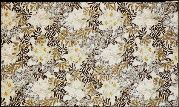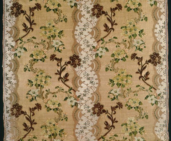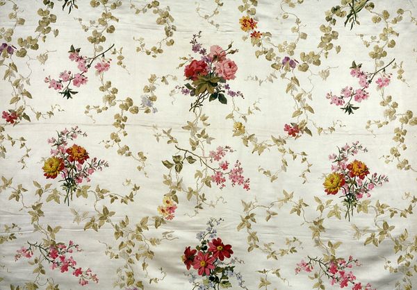 Curator: It is an intriguing pattern; however, it's equally important to understand what constitutes this "artwork" before exploring its impact. What do you think is conveyed by this pattern printed on this particular textile, during its time? Editor: We are looking at a dress fabric panel from approximately 1880, crafted by Charles Frederick Worth, housed at The Art Institute of Chicago. It looks like it utilizes both weaving and printing on textile. Initially, the gentle repeating pattern of leaves and berries gives a tranquil, almost soothing effect. I'm curious, though, what can this fabric panel reveal about its era and maker? Curator: Given its origin during the late 19th century, what do you think about Worth choosing to produce dress fabric alongside his high-fashion designs? The materiality speaks volumes. He wasn't just designing; he was engaging in the very *production* of fashionable materials. Consider how his work challenges this era’s strict separations between fine art and craft? Editor: So, the fact that a renowned designer like Worth dedicated his time to textile production…it blurs those conventional art hierarchies, right? Instead of solely focusing on unique, one-off creations, he's also immersed in mass-producing *something*. Curator: Precisely! Worth wasn't just creating exclusive garments; he was also shaping the broader *consumption* of design, making aesthetics accessible, even reproducible. This democratizing effect, through the materials themselves, had societal ramifications. Consider too, the labor involved in weaving and printing: where was it sourced? Who were the artisans? These questions help to unravel a fuller picture. What considerations are highlighted by the method in which such “textile” art are experienced as commodities? Editor: Thinking about the labor…it prompts questions about industrialization, the lives of the workers, and the whole economic structure tied to the manufacturing process of such art and consumption during that period. Curator: Exactly! It prompts us to think beyond just the pretty pattern and examine the networks of production, labor, and consumption that underpin this artwork. Worth was creating art and also producing items for consumption, shaping broader culture through materiality. Editor: This fabric panel isn’t just about its decorative beauty; it represents so much more. By understanding Worth’s intentions to be both artist and manufacturer during a period when the Industrial revolution started reaching full speeds, one can see an attempt to challenge traditional notions, of both “art” and consumer goods.