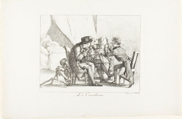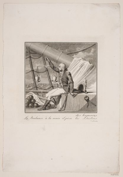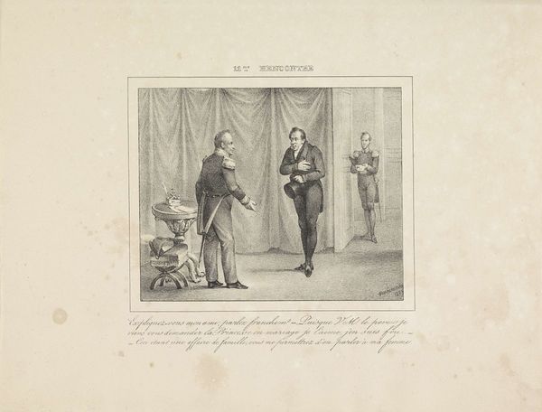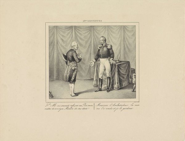 This anonymous work from 1830, entitled 'Willem I en de aangesneden kaas', is a monochrome print whose muted tones lend it a subdued, contemplative air. The composition divides the space vertically. On the right stands a figure, dominating the scene with his vertical presence, while on the left, a seated figure occupies a more recessive, horizontal position. The artist uses contrasting body language to create meaning. The standing figure exudes an air of formal authority, while the seated figure appears more relaxed, almost slumped in his chair. This visual juxtaposition hints at an underlying tension, perhaps a critique of power dynamics. The gaze of each figure directs the viewer's eye across the scene, setting up a subtle dialogue about space, authority, and representation. The linear quality of the printmaking technique adds a layer of complexity. The artwork engages with contemporary ideas about leadership and representation. It destabilizes the conventional notion of authority by presenting a leader in a moment of apparent vulnerability.
